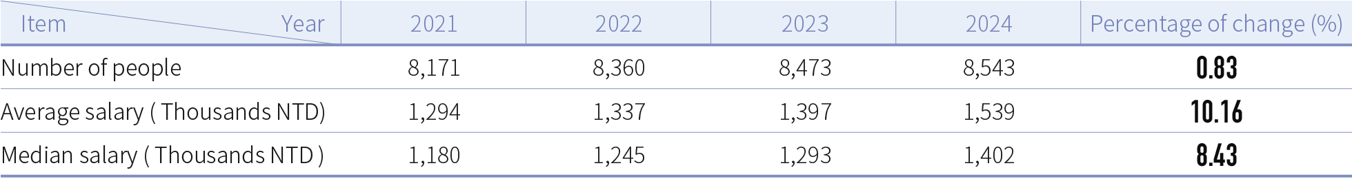 FFHC regularly references professional institutions' survey reports on market remuneration and benefit levels. Our employees' full salary is on par with the P70 level (i.e. better than 70% of our financial market peers). In 2024, a pay raise of around 4.6% was implemented across the board. After promotion and full seniority bonuses were factored in, the overall rate of pay hike exceeded 8%. The average salary of our full-time employees in non-supervisory positions was NT$1,539 thousand, up 10.16% from NT$1,397 thousand in 2023. The total employee benefit expenses amounted to NT$20.08 billion in 2024, up 7.21% from NT$18.73 billion in 2023.