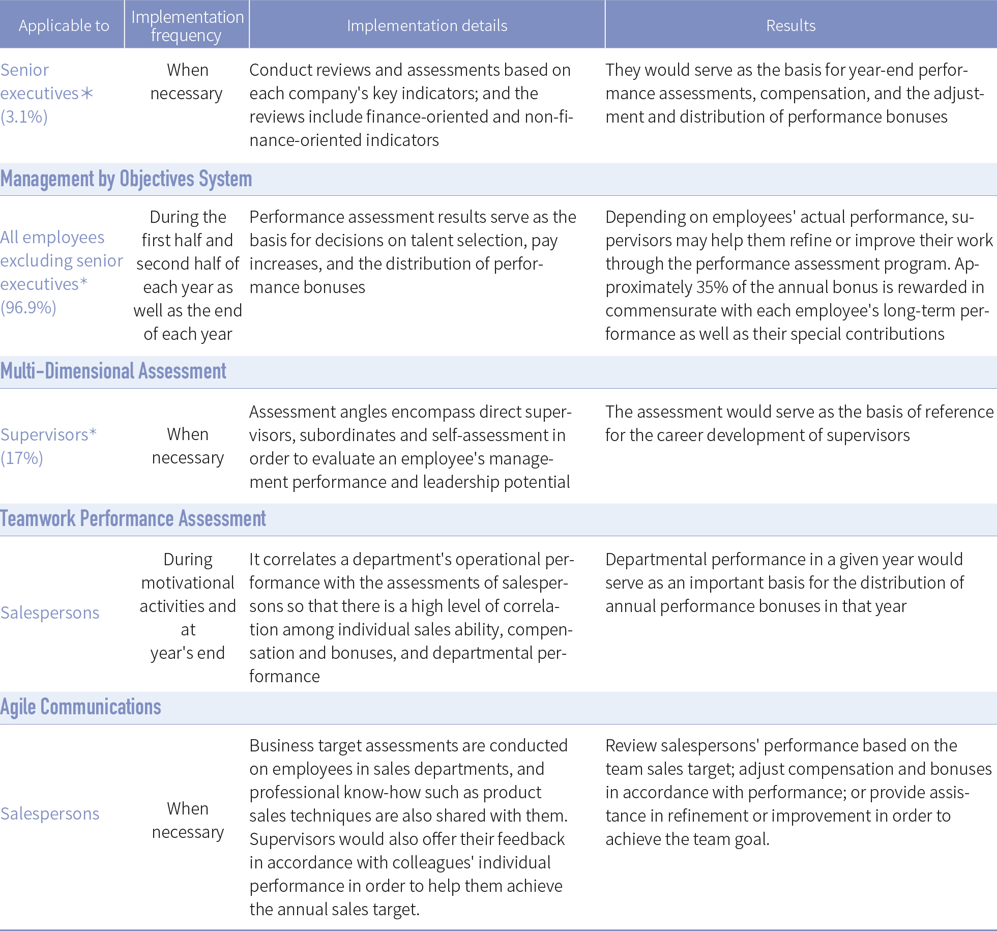 The Company provides a fair and reasonable employee performance assessment system., in an effort to build a consensus on personal goals imposed by the Company on each employee. The Company would reference each employee's mid-year assessment results to evaluate his/her annual performance at the end of each year. 35% of our employees' year-end bonuses are based on their long-term performance and special contributions. Each subsidiary has also set up its reward systems for the promotion and sales of sustainable financial products and services. ESG educational training accounts for around 5% to 6% in performance assessments. In 2024, 30.2% of group employees' compensation was related to their performance regarding sustainable financial products. The Company has also formulated the "Employees Stock Options Purchase Plan". When the Company conducts a round of cash capital increase, we would allocate shares to each company's employees at prices more favorable than market subscription prices, in commensurate with their pay grades, tenure periods and performance. Tenure and pay grades are also factored in when calculating employee compensation. When evaluating employee promotions, we would also take into account their assessments and award/punishment records from the past nine years. When selecting and promoting management trainees, we would also consider their assessment results from the past five years, in addition to making participation in volunteering events a prerequisite. It is evident that the Group's employee compensation is highly correlated to their long-term performance and our sustainable development strategies. Additionally, we strive to promptly respond to market trends and changes by shaping a culture of agile communications that values teamwork.
