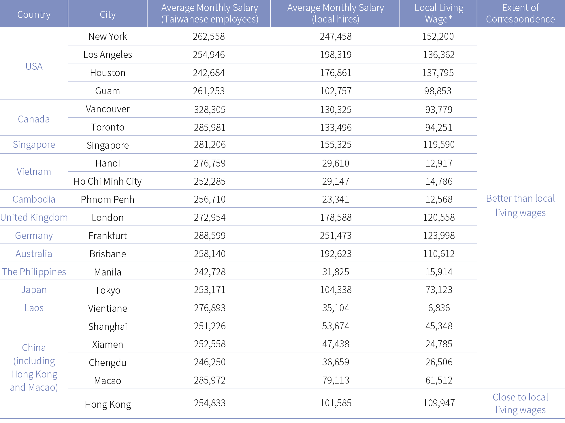 The average monthly salary of FFHC's employees at our overseas business locations, regardless of whether they are of Taiwanese nationality or local hires, is higher than or close to living wages. We adopt the Anker Methodology for Estimating a Living Wage. Using Numbeo's database and the monthly necessary living expense promulgated by Taiwan's Ministry of Health and Welfare, we have established FFHC's living wage database for our business locations around the world, which is used to evaluate the gap between employees' salaries and living wages. By doing so, we are able to realize a workplace that respects labor based on FFHC's fair compensation framework.