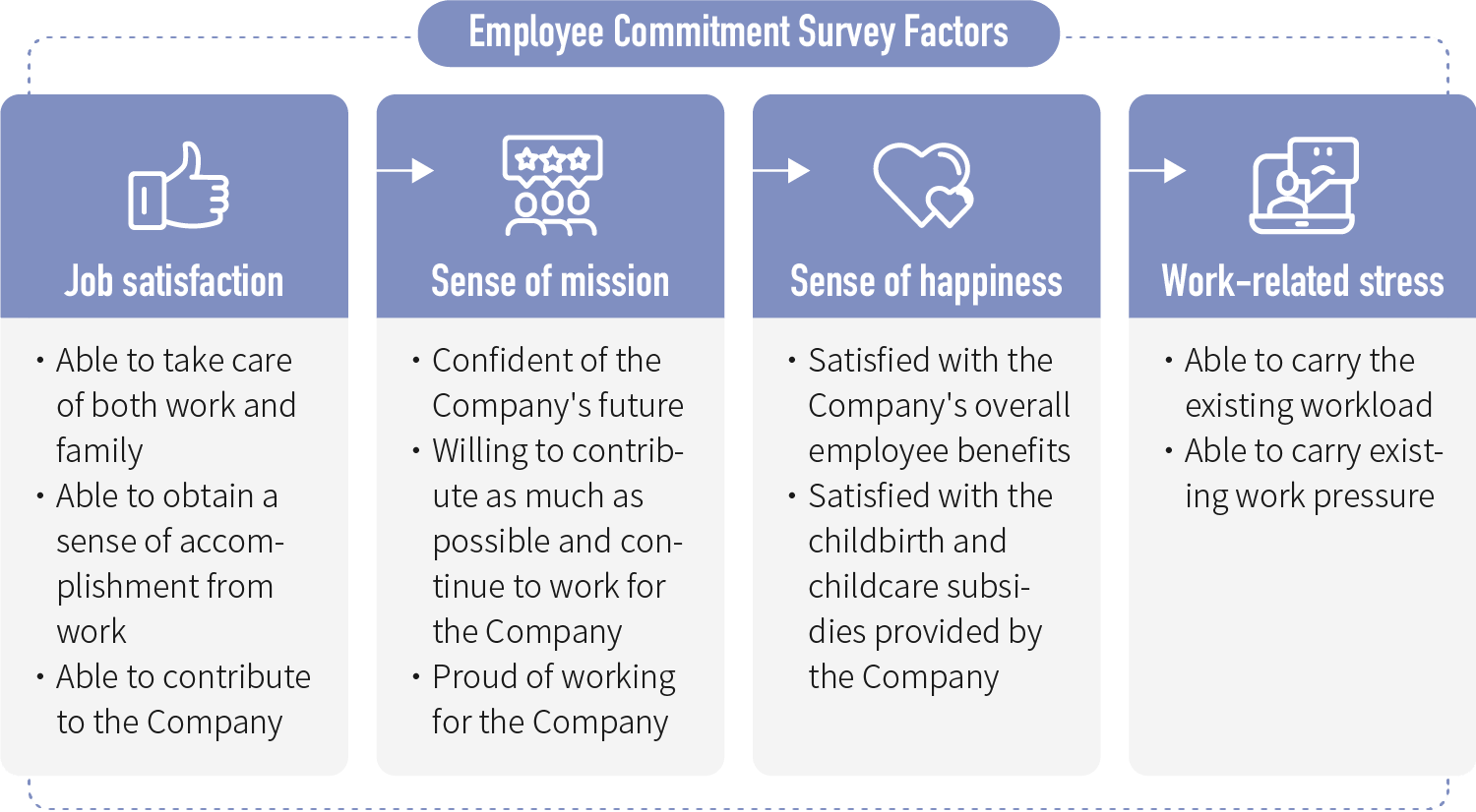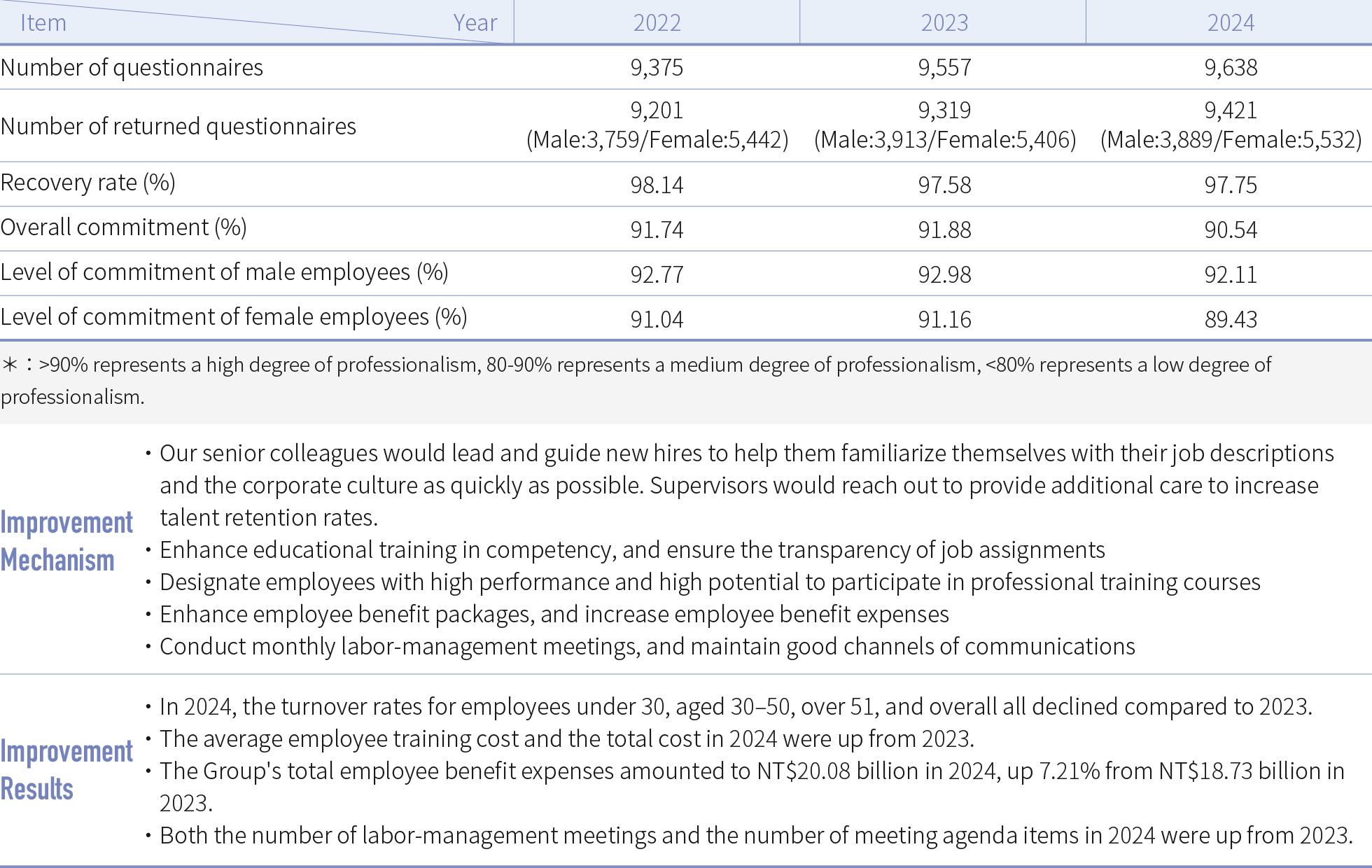 ・We conduct employee commitment surveys as channels for them to express opinions. We also formulated improvement mechanisms to follow up on the effectiveness of improvements.