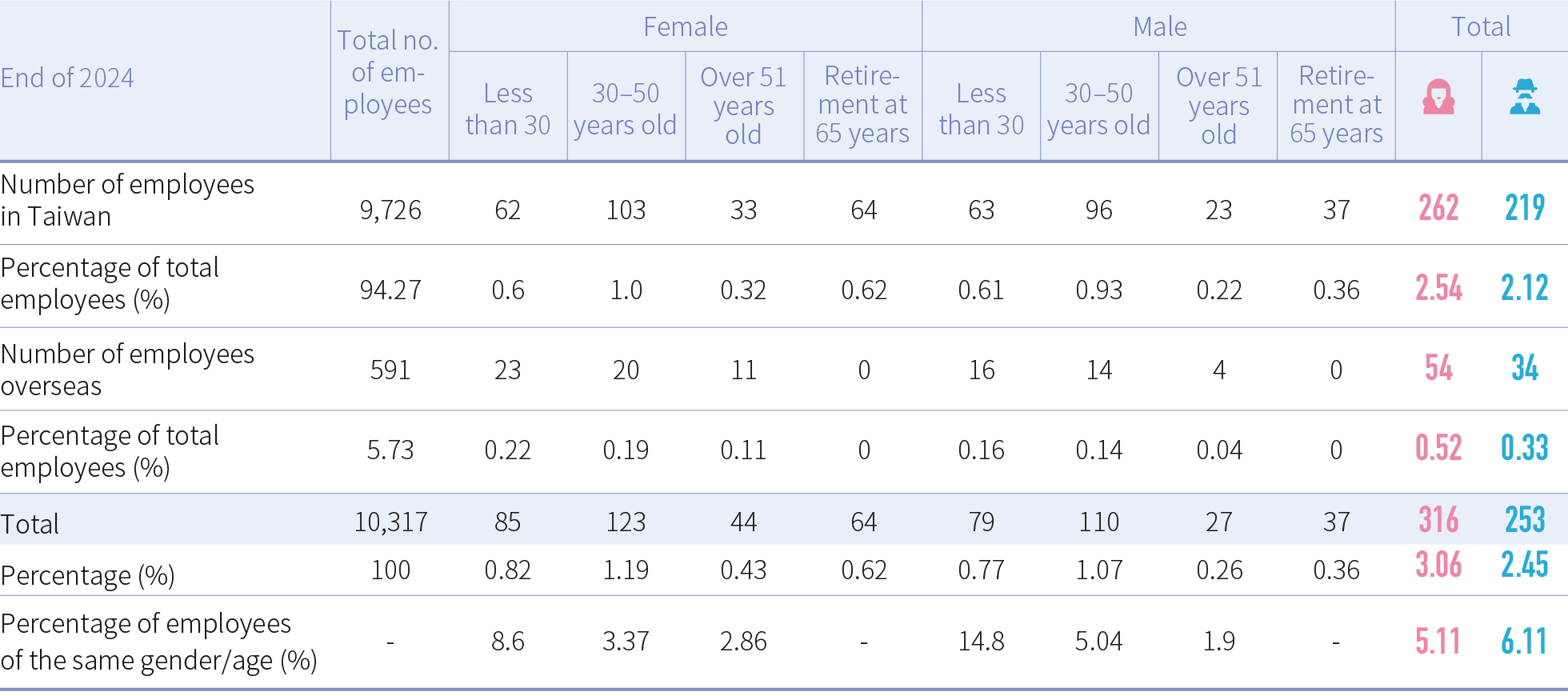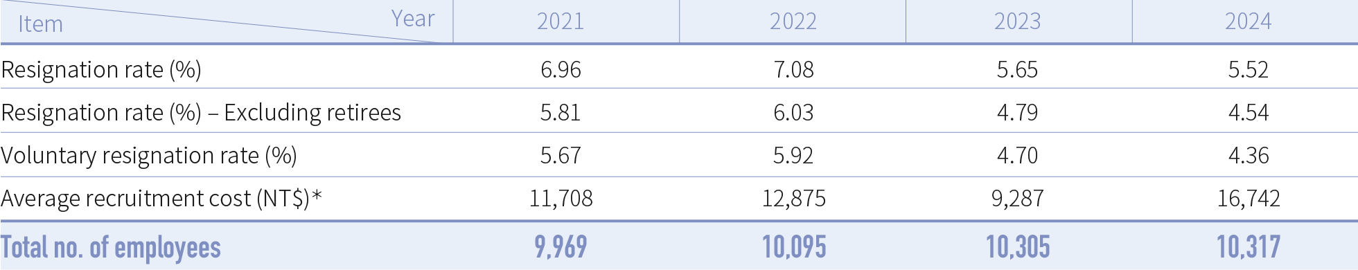 To promote internal talent flows and plan for employee career development, we value employees' on-the-job training, in addition to enhancing the disclosure of information pertaining to internal job openings. We also enforce systemic job rotations in hopes of reducing employee turnover rates. At the end of 2024, the Group's turnover rate stood at 5.52%. However, the turnover rate was 4.54% after deducting those forced to retire in compliance with the Labor Standards Act. As of the end of 2024, 76.67% of our internal job vacancies had been filled.