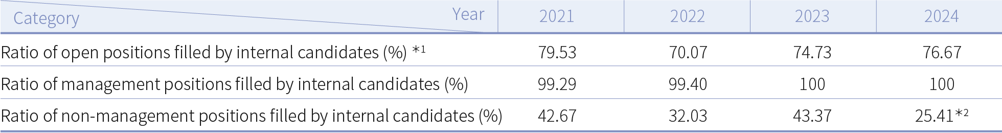 *2:Due to the fact that more professional job openings related to IT and compliance became available in 2024 and that they were difficult to be filled via internal transfer, the openings were mostly taken up by external hires. Hence, there was a decline in the fill rate of non-supervisory positions.