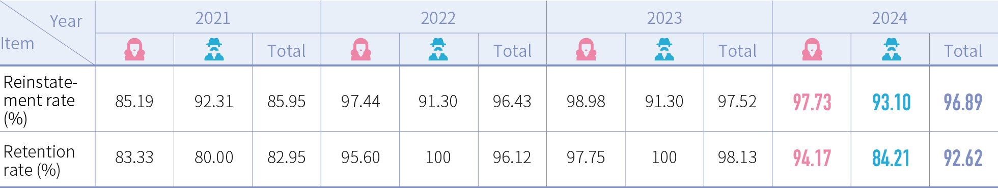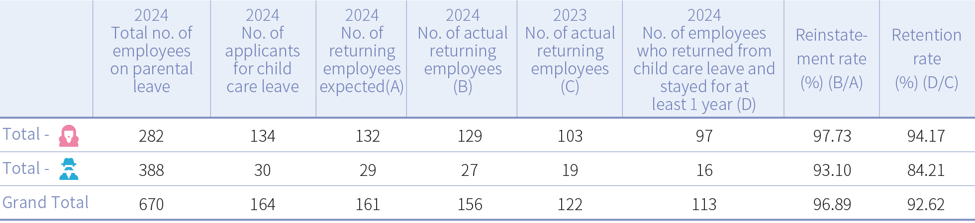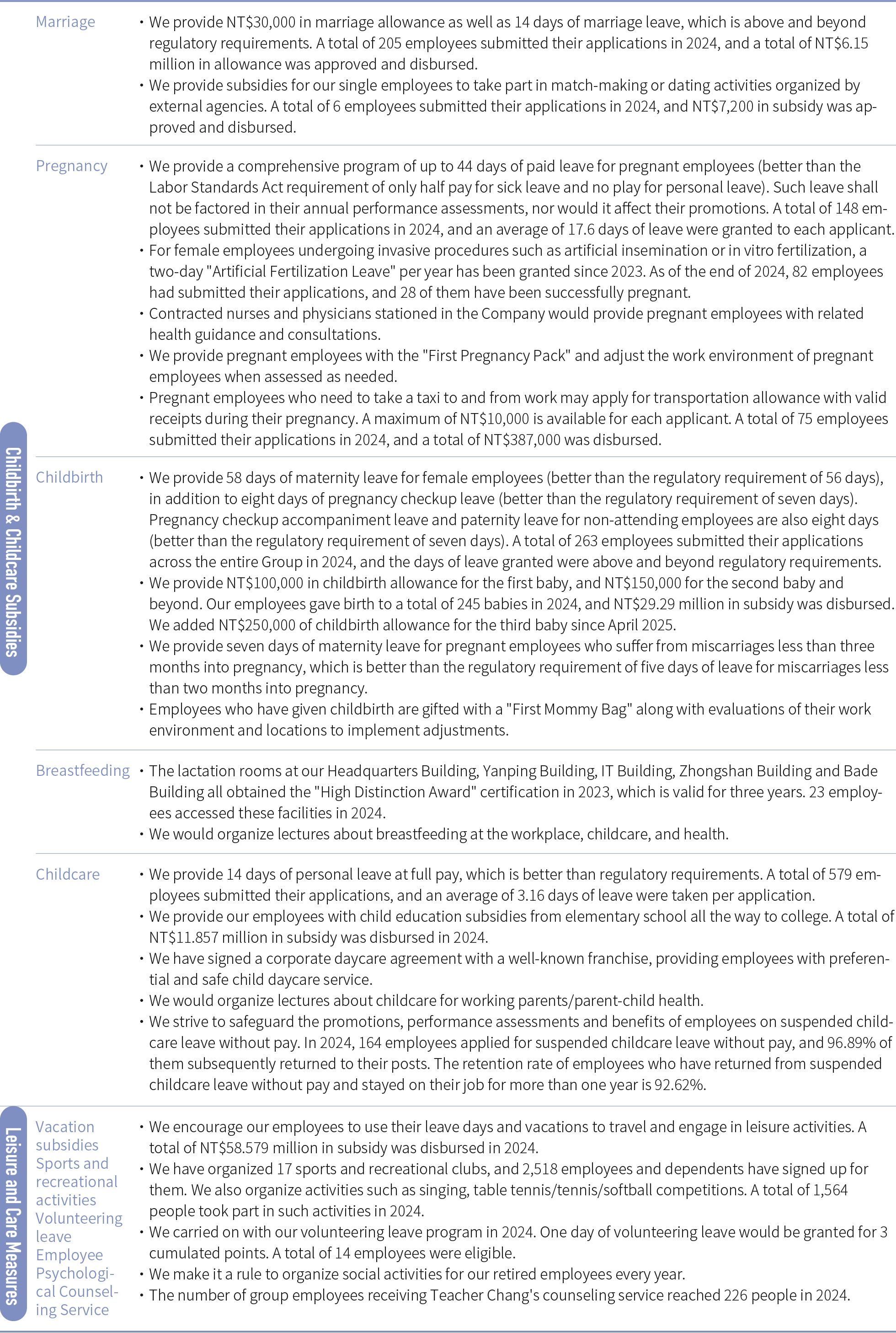 *: FFHC safeguards our employees' right to apply for parental leave in accordance with law. Regardless of whether they are the main caretakers (female employees) or non-main caretakers (male employees), they can all apply for six months (24 weeks) of parental leave, in addition to an average of 80% of their monthly insurance salary of Labor Insurance.