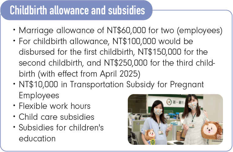 First Financial Holding Co., Ltd. (FFHC) implements the Gender Equality Policy in spirit of the Convention on the Elimination of All Forms of Discrimination Against Women (CEDAW) and in compliance with the Act of Gender Equality in Employment. We promote gender equality by focusing on "corporate culture," "organizational structure," "salary and benefits," "education and training," "work-life balance," "child birth measures," and "workplace safety" to create a friendly, gender-equal environment for employees, thereby realizing our vision of becoming a happy enterprise.