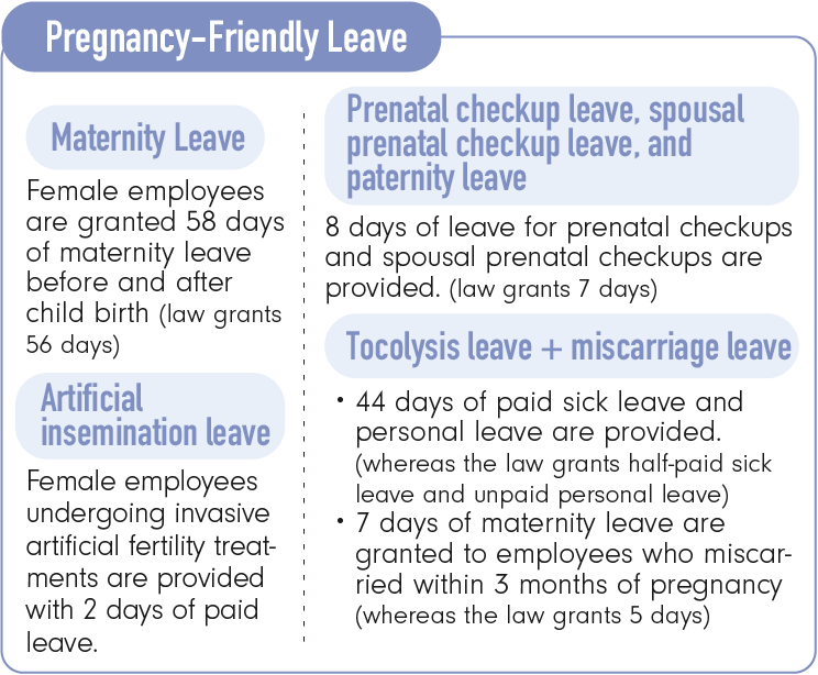 For more information on gender equality measures for maternal employees, please refer to 4-4 Friendly, Healthy and Happy Workplace.
