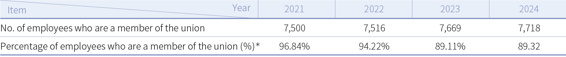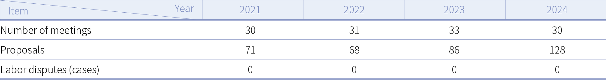 The Company has set up diverse and confidential employee communication channels to build harmonious employee and employer relations and enhance both the development of the Company and employer welfare. The Employer-Employee Meeting consists of an equal number of labor and management representatives. Regular meetings are held to discuss employer-employee issues such as improvements to working conditions and benefits. In 2024, there were no penalties resulting from labor dispute complaints. The number of employer-employee meetings held and the number of proposals discussed over the past four years are summarized in the table below.