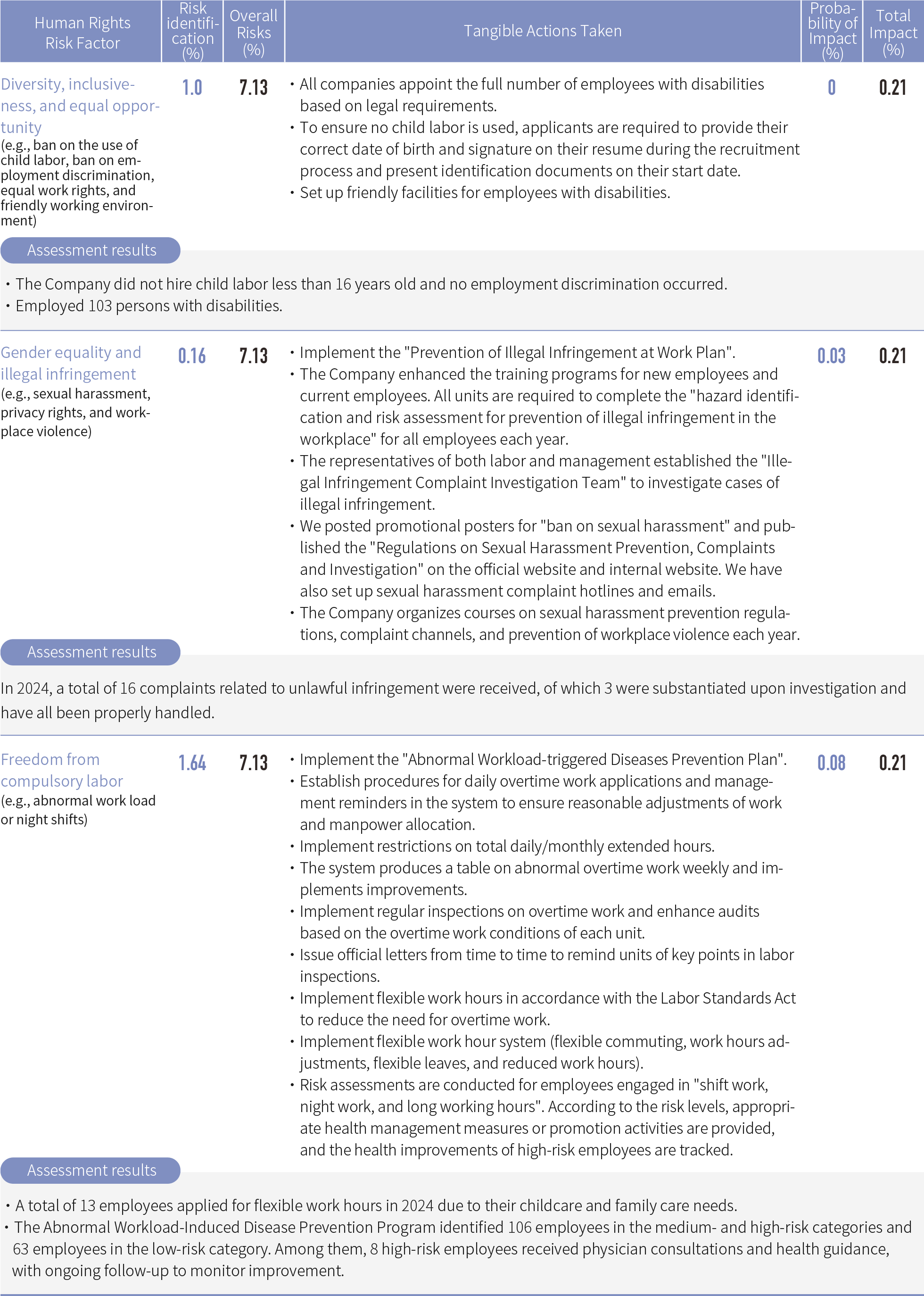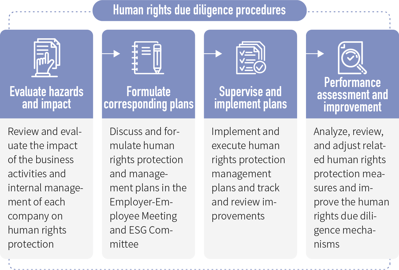 The Company's Sustainable Development committee reviews relevant humanrights issues each quarter and uses actual investigations, data monitoring, and questionnaire surveys to evaluates potential human rights risks and establish a risk matrix for human rights issues.