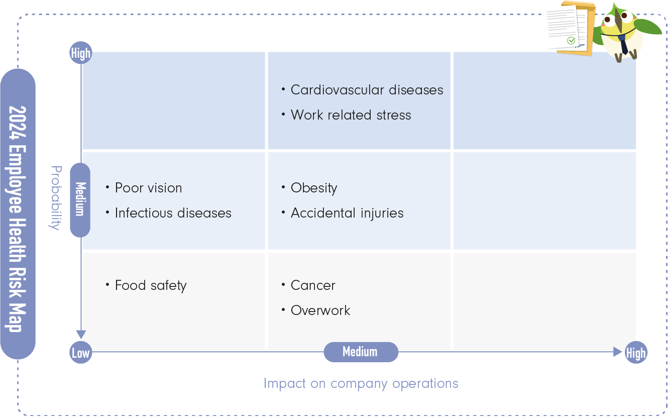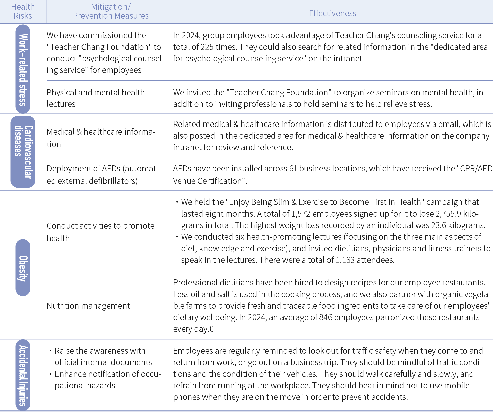To effectively safeguard employees' safety and health, FFHC builds on the foundation of the Occupational Safety and Health Act and PDCA management cycle to identify safety hazards that may arise from various operating procedures, content and environments in accordance with important indicators such as job types, operating environments, automatic inspection plans, health examination results, age, and gender. An employee health risk map was produced based on their incidence rates and the level of impact on company operations. The map indicates that obesity, accidental injuries, cardiovascular diseases and work-related stress were the four major high and moderate risk factors in 2024. Based on these findings, we have formulated various mitigating and prevention plans targeting health risks, in order to effectively reduce the incidence of occupational hazards and health risks among our employees.