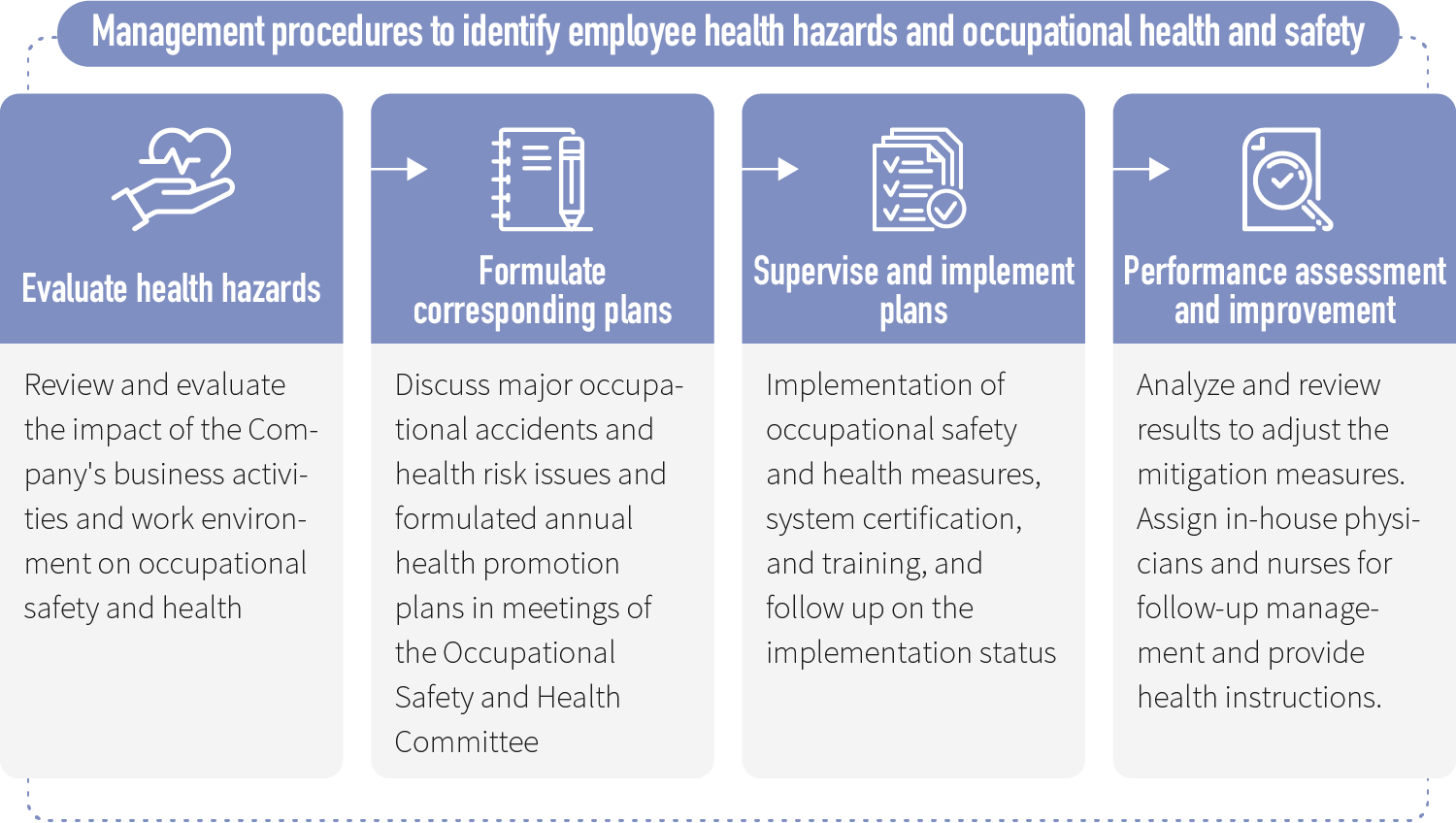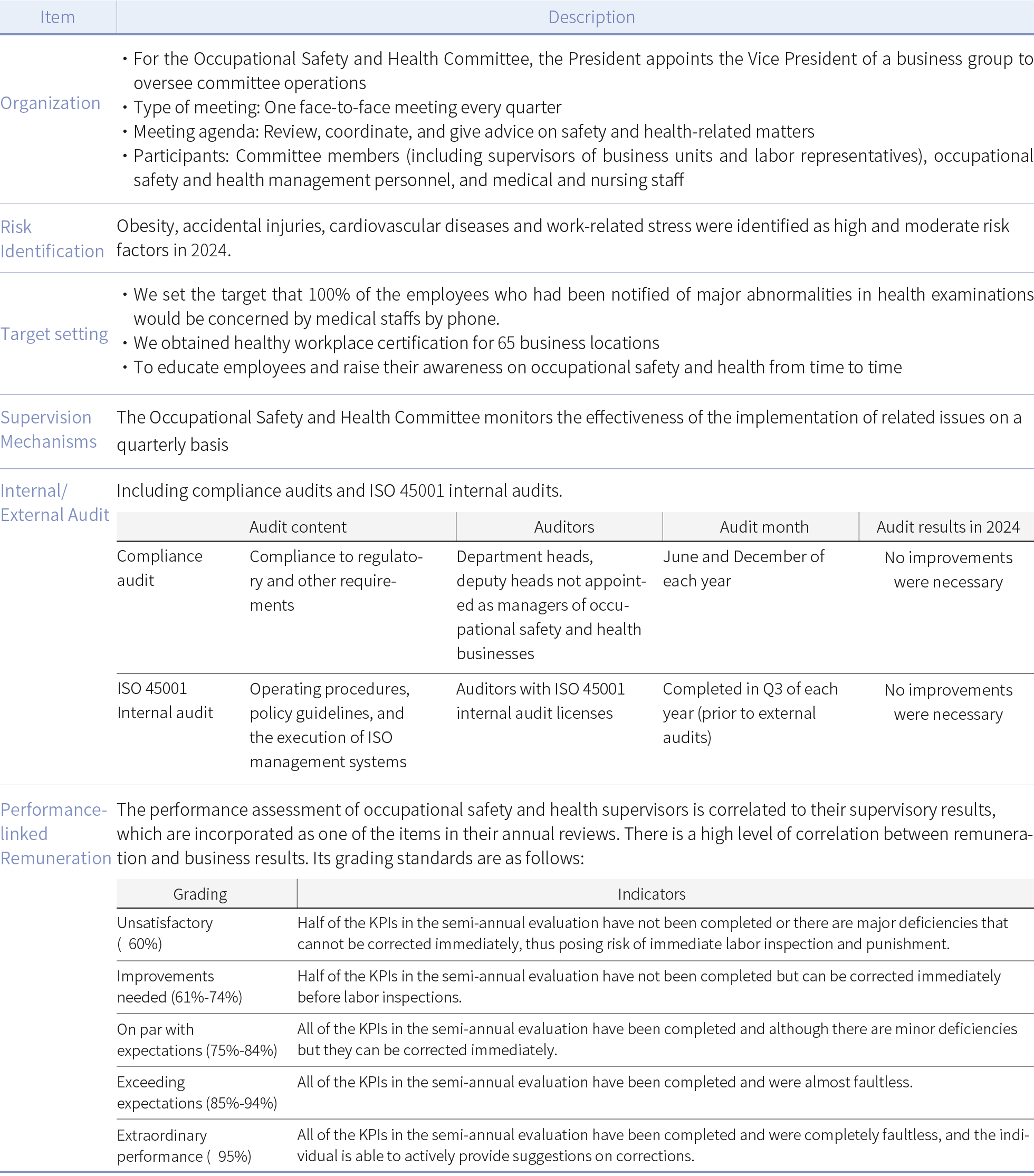 The Company has established an "Occupational Safety and Health Committee" (OSH Committee) in accordance with the related workplace safety laws. The committee will have 7 members comprising of the employer, labor representative and department manager, with 3 members, or 43% coming from the labor union. Conduct quarterly meetings to review various health related issues, prevention of illness and health promotion matters, occupational hazards reports and others. Pay attention to employee health and workplace safety issues, in addition to the regular tracking of the progress of implementing items agreed upon in the meeting such as: safeguarding public safety in the workplace, tracking and management of employee health, supervision of safety and hygiene, and other measures beneficial to improving workplace safety and hygiene management.