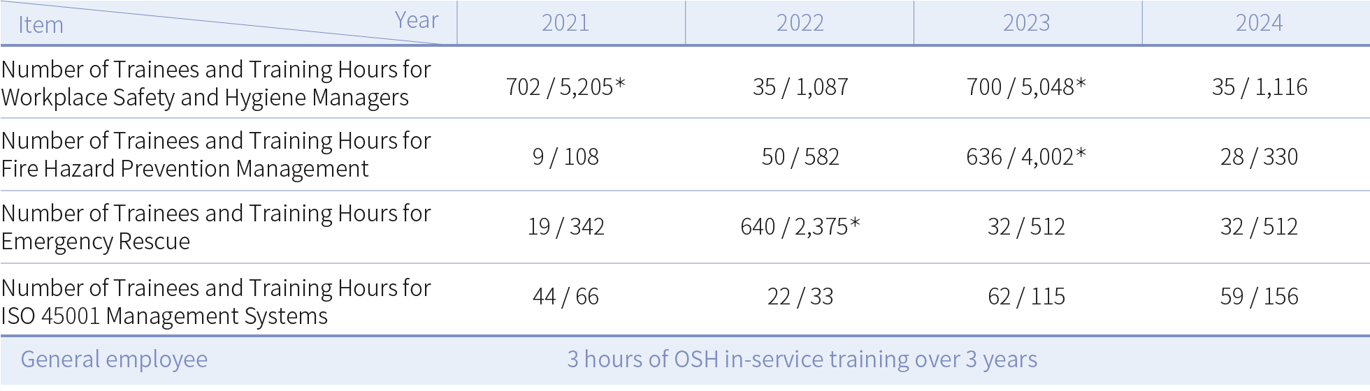 All business units have appointed an OSH supervisor, first-aid personnel and fire-prevention manager to protect the safety and health of business units. Certified personnel are also dispatched to receive on-the-job training in accordance with the frequency specified in regulations to keep their OSH knowledge up to date. A continuous workplace safety and health inspection plan is also practiced to build an accident-free workplace.