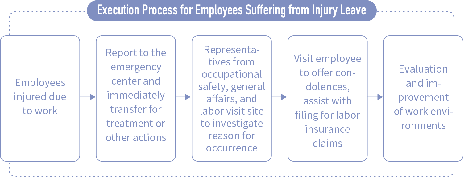 Aside from complying with the "Incident Reporting Guidelines" to immediately report employees who have suffered accidental injury due to work or in the workplace, follow-up for accidents in the workplace must be conducted by the supervising department of occupational health and safety, the general affairs maintenance and repair department, the department supervisor of where the incident occurred, and a labor representative who must visit the incident site together to investigate, understand, and analyze the reason for disaster to plan preventative measures; once rectification is complete, records should be maintained for future follow-up. Support and assistance should be provided to employees as soon as possible to minimize injuries and apply for labor insurance claims or provide injury leave based on actual conditions. A total of 54 employees applied for injury leave in 2024; 0 employee suffered from occupational diseases; a total of 16 employees (including dispatch and security personnel) suffered from occupational accidents.