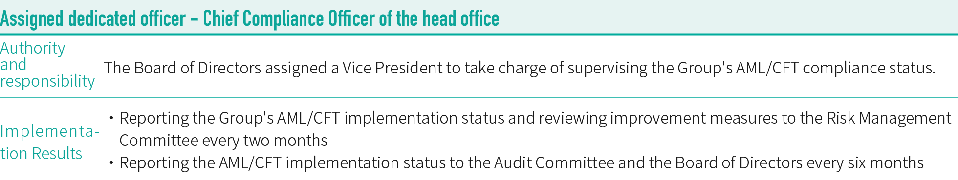 ・The New Actimize System has been installed for overseas branches and AI monitoring technology has also been introduced, in order to enhance control over related accounts and detect potential risks of money-laundering transactions.