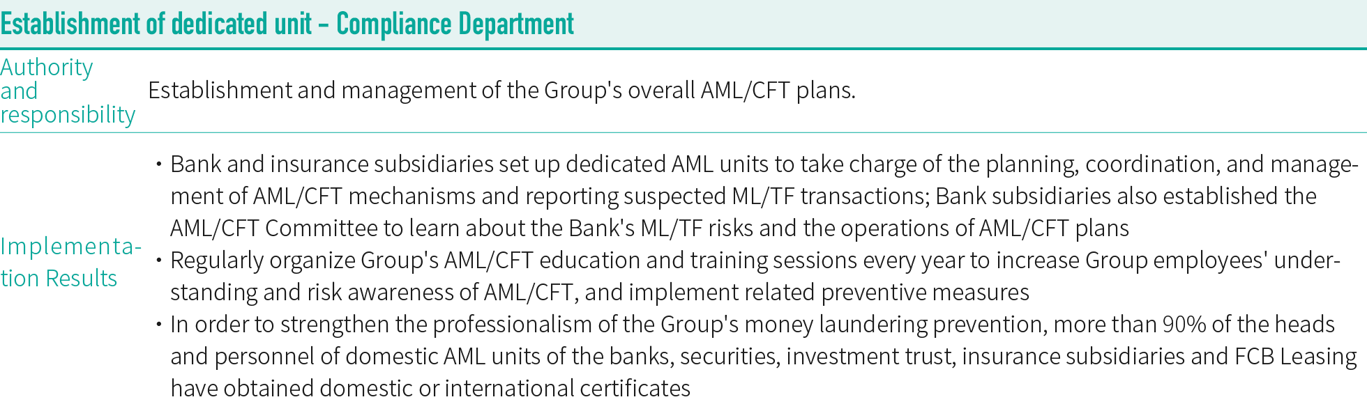 In addition to using the 53 suspicious transaction representations in the "Annex: Red Flags for Transactions Suspected to Involve Money Laundering or Terrorism Financing" published by the Bankers Association to monitor criminal behavior, the Group's subsidiary bank also compiles statistics from cases provided in letters from external inspection agencies to identify the crime risks that it faces. It has also adopted corresponding mitigating measures. The top 3 threats associated with money laundering and terrorism financing that the Bank identified in 2024 were fraud, tax crimes and narcotics, which were approximately consistent with the STR crime patterns that it declared.