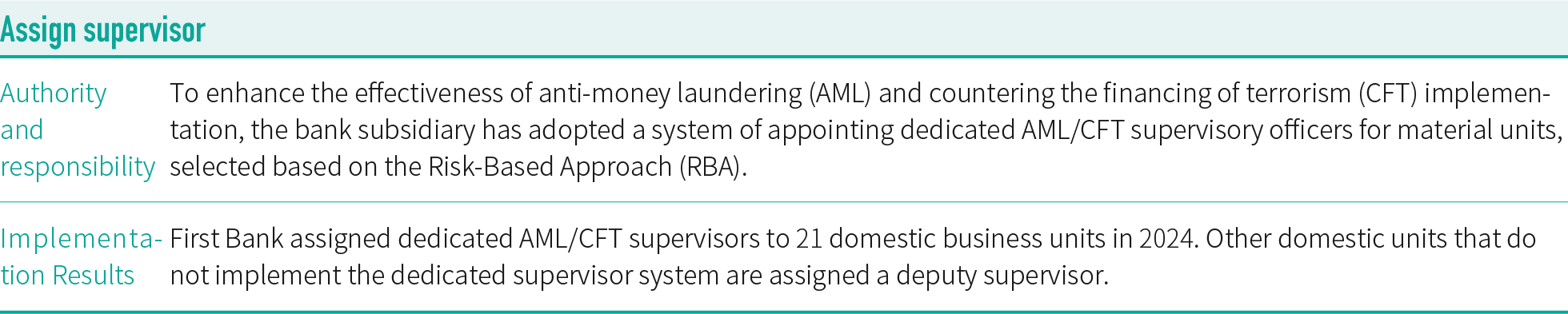 02. In 2024, the Group's subsidiaries, including First Commercial Bank, First Securities, First Life Insurance and FSITC, continued to commission "PwC Taiwan" to audit assurance projects for anti-money laundering & counter-terrorism financing, which went above and beyond the Financial Supervisory Commission's existing regulatory requirement of demanding that banks and large insurance companies outsource the auditing of their assurance projects.