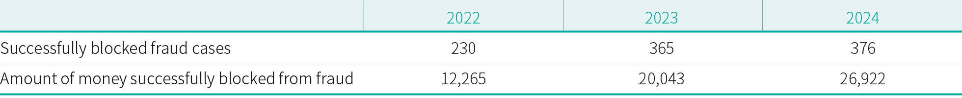 As financial fraud incidents are quite rampant recently, the subsidiary bank has joined the Criminal Investigation Police Office's "Eagle Eye Anti-Fraud Alliance" to prevent customers from sustaining property losses. The Bank has developed an AI-enabled early-warning mode for account warning, enhanced monitoring and control over transactions, and signed a "Letter of Intent for Cooperation in the Anti-Fraud Project" with the Criminal Investigation Police Office on March 25, 2025, in order to jointly counter financial fraud. The Bank also plans to introduce the "associated network and dynamic money flow" analytical tool, and establish a "Bank-wide Joint Defense Mechanism", as part of its efforts to stay on top of all accounts with suspicious money flow while improving the successful rate of fraud interception. For over-the-counter operations, the Bank has formulated the "Gentle Reminders & Questions for Over-the-Counter Operations" and "Notices for Business Units to Protect Account Holders from Fraud & Be Mindful of Large Sums of Over-the-Counter Cash Withdrawals". With respect to customers who are making a withdrawal/remittance, applying for designated account transfer, elderly customers making a withdrawal exceeding a certain amount, or those who have manifested early warning signs or suspicious signs of fraud, the Bank would reach out to them with gentle reminders and questions. We would also notify the local prescient in a timely fashion for on-site investigation or police escort. Furthermore, the Bank has enhanced its employee education training to reach out to customers over the counter, as we properly utilize case studies provided by the National Police Agency as well as media reports of the latest fraud schemes, in order to boost interception effectiveness. In 2024, our performance in countering financial fraud continued to grow, as the number of cases and the amount were up by 3% and 34.3% respectively from 2023.