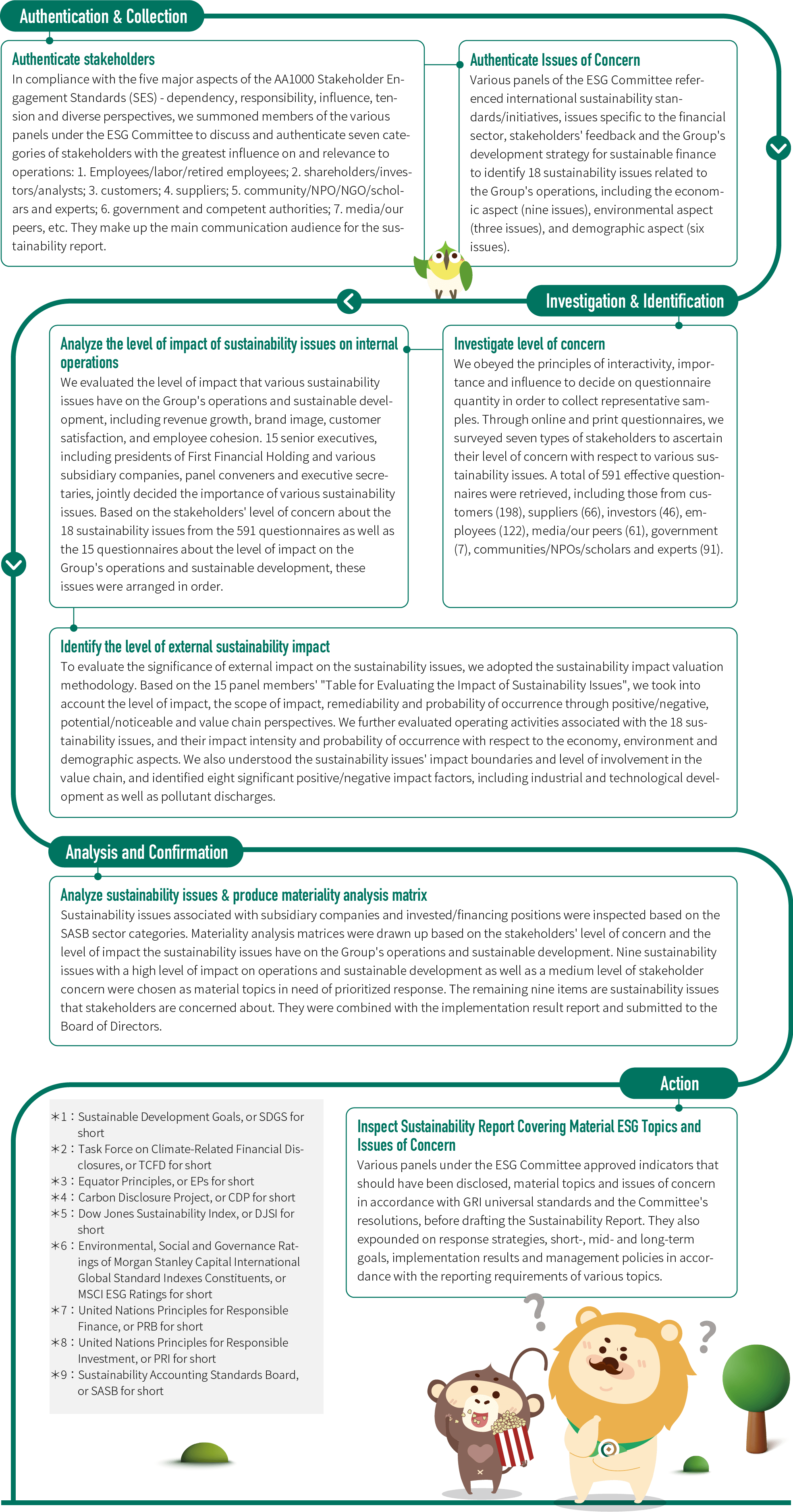 Since publishing its 2011 Sustainability Report in 2012, First Financial Holding has demonstrated its long-standing commitment to sustainable management and information disclosure. We also view stakeholders' comments and feedback as important basis for formulating our sustainable development strategy. We actively listen and respond to stakeholders' demands and expectations, in order to ensure that the content of our reports are highly relevant and responsive. During the course of identifying material topics, First Financial Holding took a deep dive to understand stakeholders' concerns and focus on environmental, social and governance (ESG) issues. We also referenced international sustainability standards and initiatives, such as the GRI Standards, ISO 26000, SDGs*1, TCFD*2, and the Equator Principles*3; International sustainability ratings such as CDP*4, DJSI*5, MSCI ESG Ratings*6, the financial sector's specific issues PRB*7, PRI*8, SASB*9, GRI industrial disclosure index for the financial services industry, communication with stakeholders and their feedback, integrated international sustainability disclosure standards, and the Group's development strategy for sustainable finance serve as the basis for analyzing material topics. To further respond to GRI 2021 Universal Standards G3: Material Topics 2021, the Group integrated the impact assessment methodology, which encompasses the economy, environment and demographics (including human rights) aspects and was developed by institutions including the Value Balancing Alliance (VBA), Harvard Business School's Impact-Weighted Accounts Project and London Benchmarking Group (LBG). We also incorporated the Double Materiality approach recommended by the European Financial Reporting Advisory Group (EFRAG), and adopted the monetization and non-monetization methodologies to build an analysis flow encompassing impact and financial materiality (four major stages and seven major steps). Taking both the "organizational operation impact" and "economy, environment and people/demographic impact" into account, we evaluated the impact of sustainability issues from perspectives inside and outside the organization, respectively. By doing so, we were able to identify nine material topics with substantive and positive/negative impact on economy, environment and demographics (including human rights). These are the material topics we prioritized for response. The other nine are sustainability issues that stakeholders are concerned about, and they form the basis for report drafting.