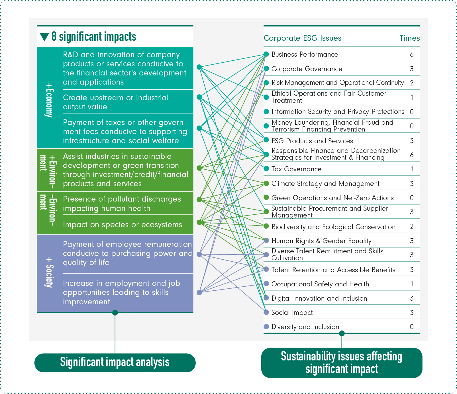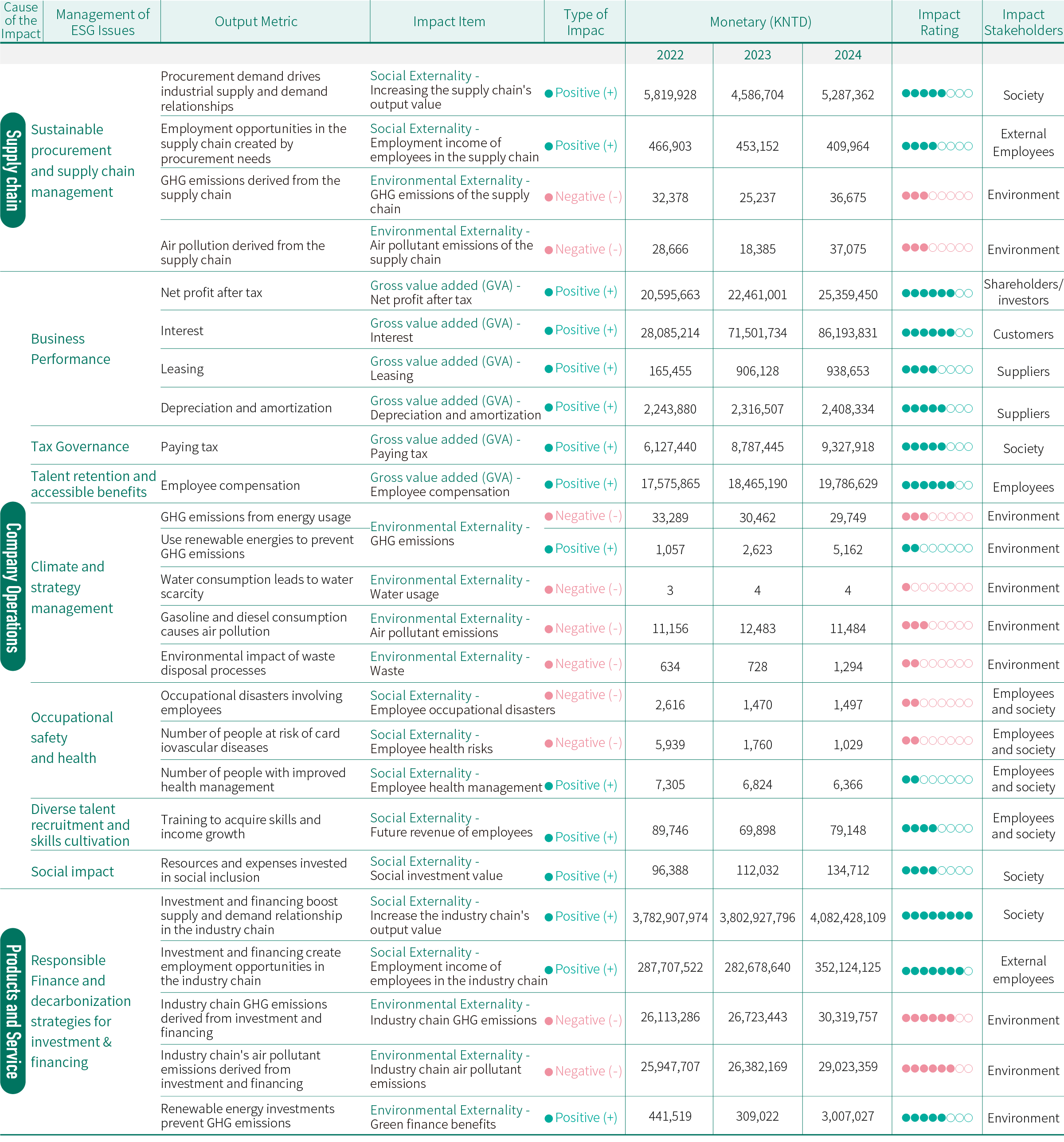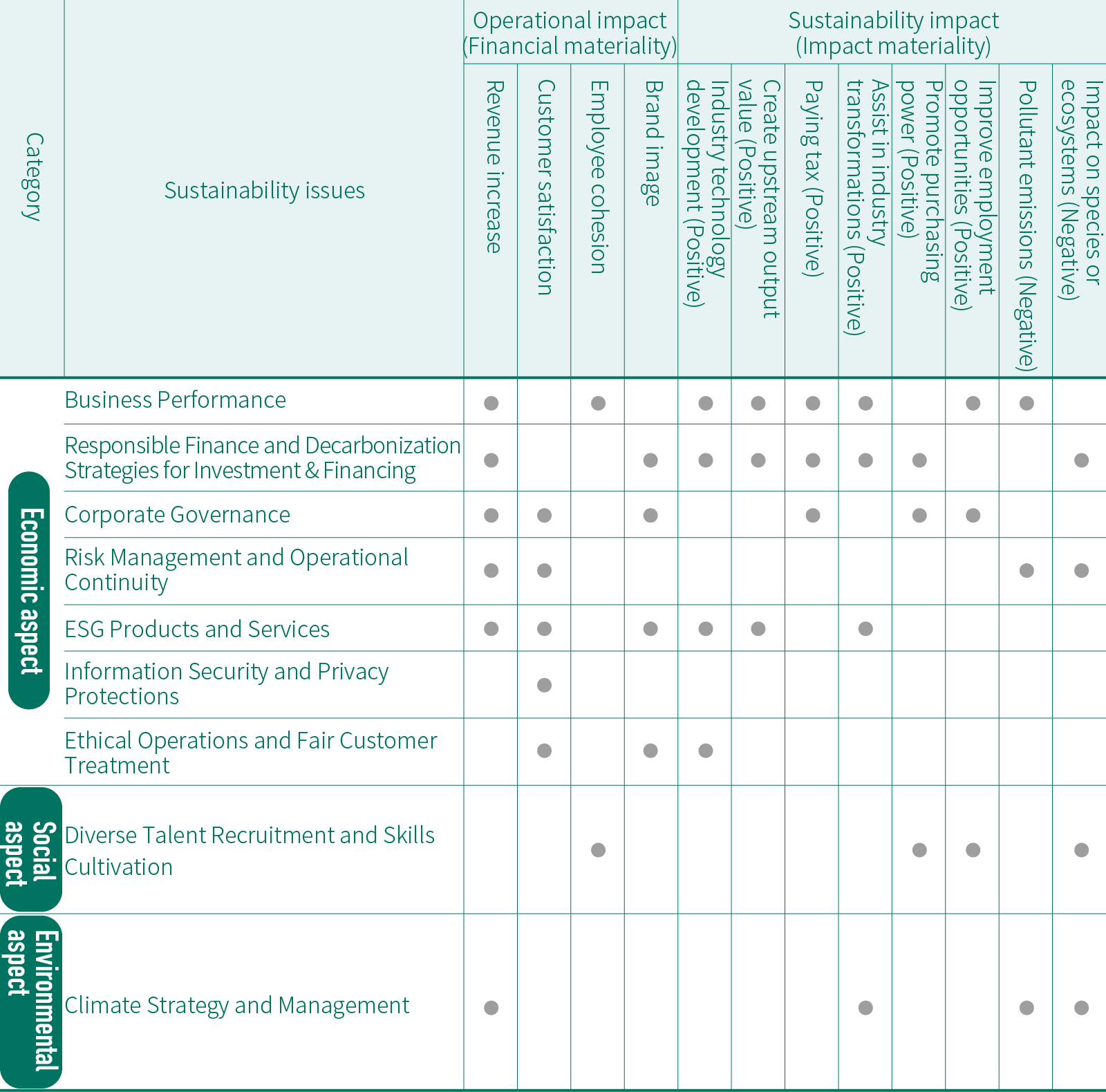 These include: "positive economic aspect: R&D and innovation of company products or services conducive to the financial sector's development and applications"; "positive economic aspect: create upstream or industrial output value"; "positive economic aspect: payment of taxes or other government fees conducive to supporting infrastructure and social welfare"; "positive environmental aspect: assist industries in sustainable development or green transition through investment/credit/financial products and services"; "negative environmental aspect: presence of pollutant discharges impacting human health"; "negative environmental aspect: impact on species or ecosystems"; "positive people/human rights aspect: payment of employee remuneration conducive to purchasing power and quality of life"; and "positive people/human rights aspect: increase in employment and job opportunities leading to skills improvement". This indicates that the Group attaches great importance to the management of sustainability issues, including business performance, Responsible Finance and decarbonization strategies for investment & financing, diverse talent recruitment and skills cultivation, ESG products and services, climate and strategy management, and corporate governance.