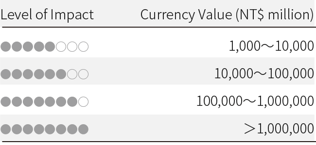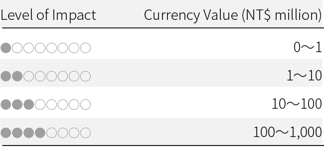 *1:「★」represents monetary value between NT$0 and 10 million;「★★」represents monetary value between NT$10 million and 1,000 million;「★★★」represents monetary value between NT$1,000 million and 100,000 million;「★★★★」represents monetary value greater than NT$100,000 million.