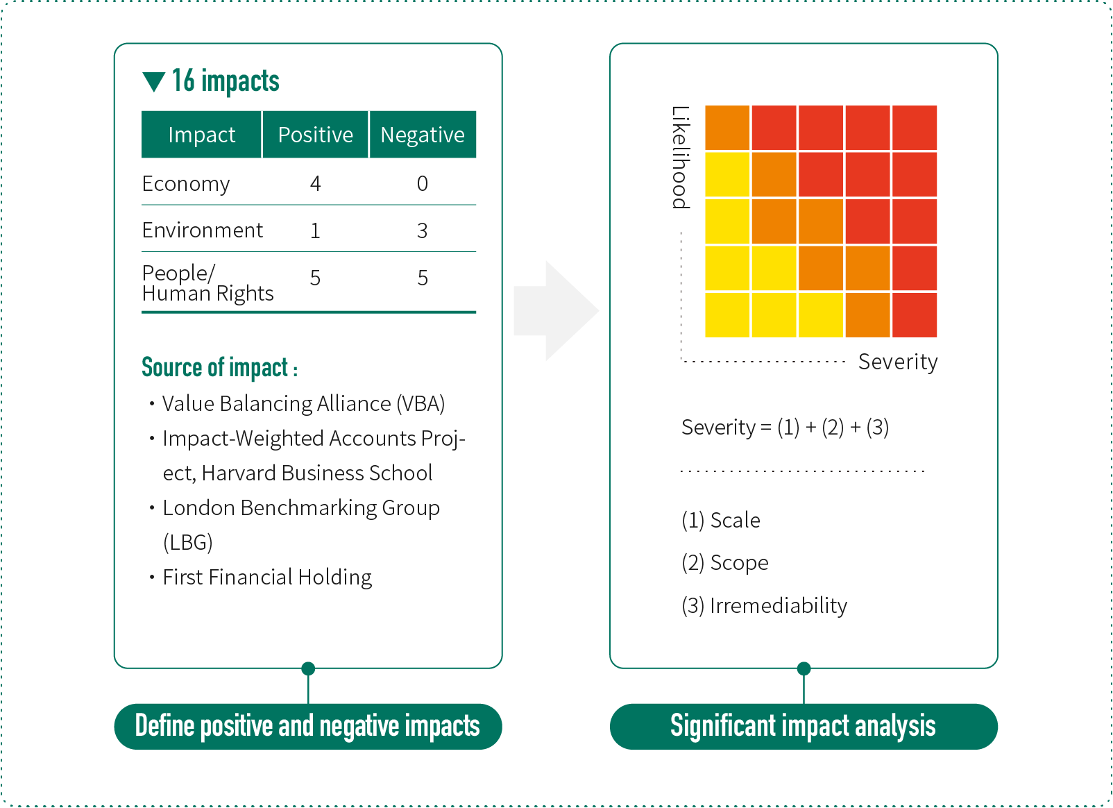 16 external impact factors relating to economy, environment and people/human rights were adopted through a survey. Taking into account their severity (including the level of impact, scope of impact and remediability) and probability of occurrence, we identified eight significant impact factors, after reaching a consensus through suggestions from external and internal experts and internal executive meetings.