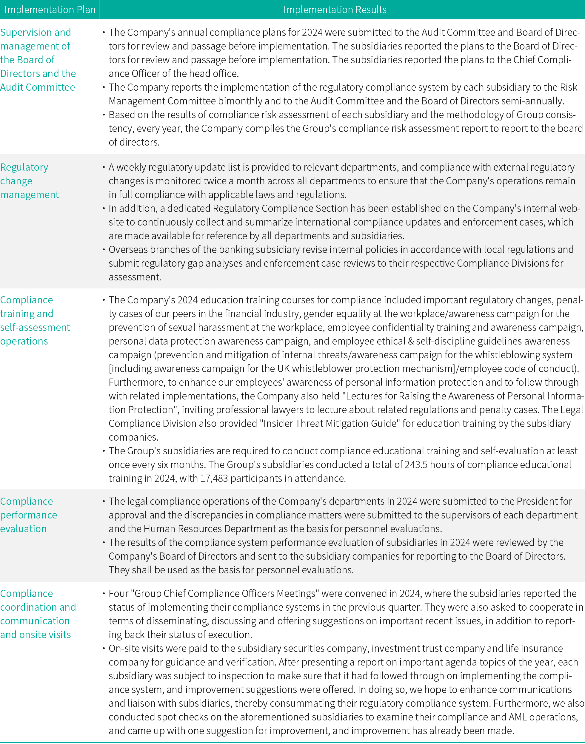 FFHC, First Bank, First Securities, First Securities Investment Trust and First Life Insurance have all established dedicated compliance units reporting to the president in accordance of the law. Other subsidiaries also appointed the Chief Compliance Officers at their head offices. The Chief Compliance Officers are responsible for the planning, management and execution of the regulatory compliance system at their respective companies. FFHC is continuing to require all subsidiaries to enforce their compliance systems. Related developments in 2024 are as follow: