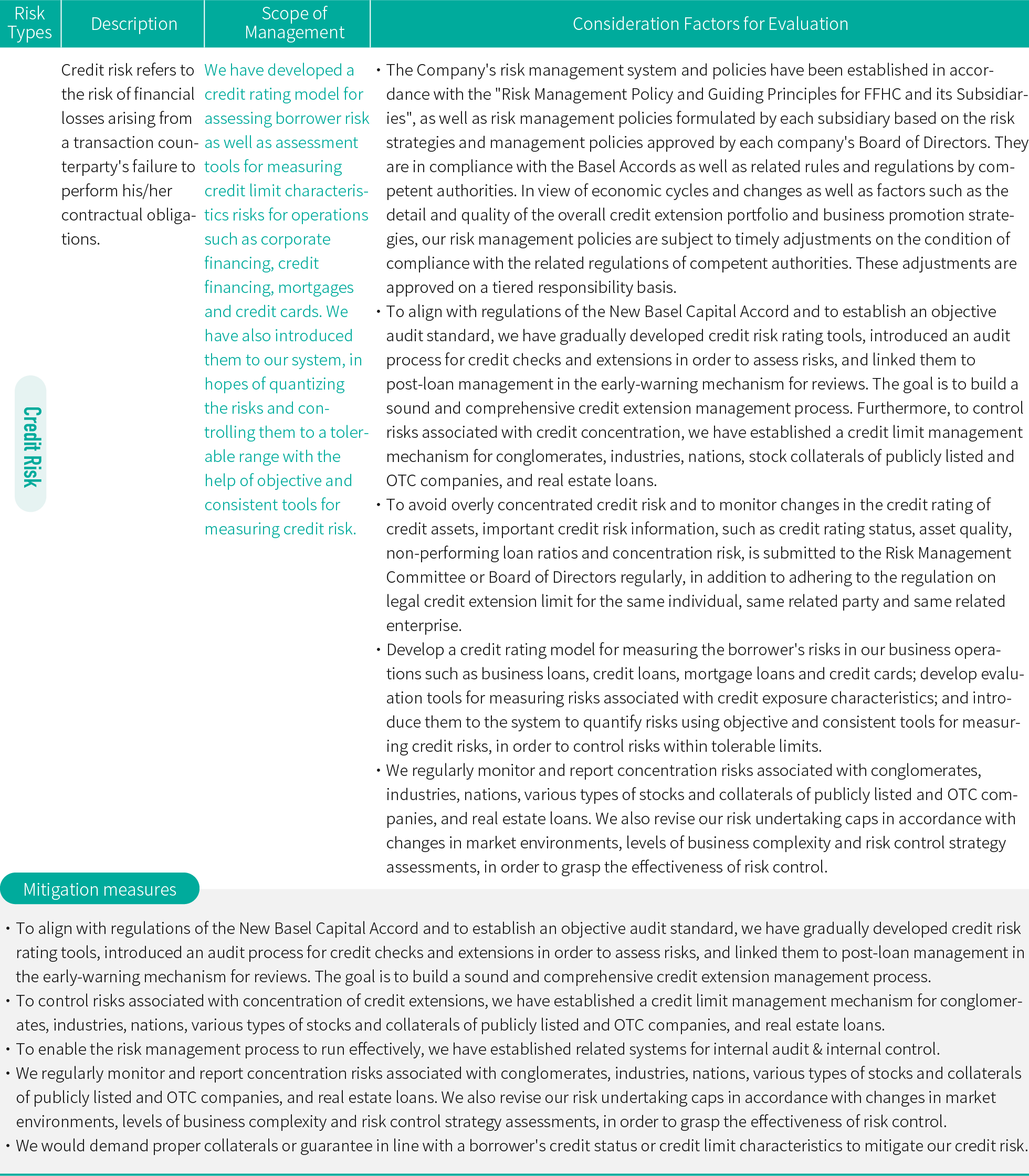 FFHC's Board of Directors is the top policy-making unit when it comes to Group risk management. A "Risk Management Committee" has been established under it. The Chairman serves as the committee chairperson, while the President, VPs and the chairmen and presidents of subsidiaries serve as committee members. A meeting would be convened once every two months to supervise and examine the effectiveness and implementation status of the Group's and each subsidiary's risk management, which is reported to the Board of Directors on a regular basis. The Risk Management Department is responsible for carrying out various risk management policies.