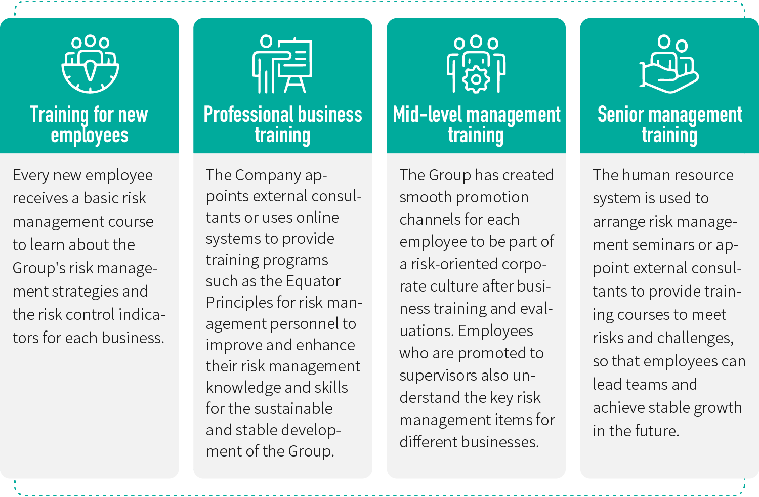 ・We publish the risk management newsletter each month and use the "Risk Management Report", "Special Report", and "Risk Management Terminology" to enhance the risk awareness of all employees and increase their professional knowledge and skills.