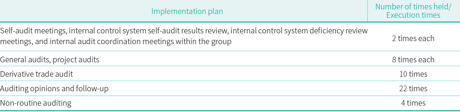 •We continue to follow up on review opinions of internal audit units, accountants, and business administration units or deficiencies proposed by internal audit units, and matters requiring improvement listed in the internal control system statement. Improvements are submitted in writing to the Board of Directors and Audit Committee and used as an important item for penalties and rewards and performance evaluations of related units.