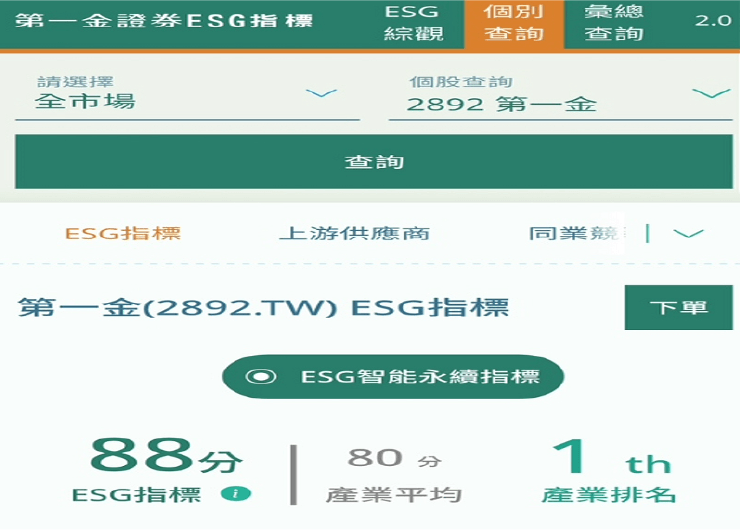 The platform provides ESG grading information to investors with the help of AI algorithms, including inquiries about individual stocks, compiled data for select sectors, ESG sub-categories, and account inventory. ETF can also be linked to constituent stocks for inquiries about the grades of individual stocks. Inquiries about such information can be made by accessing the two transaction platforms of "FCB e-Winner" and "First Gold Securities-Mobile Winner". It can also be directly linked to the area for placing an order, where the user can access the transaction page to inquire about the real-time quotes of individual stocks and place an order to buy or sell stocks.