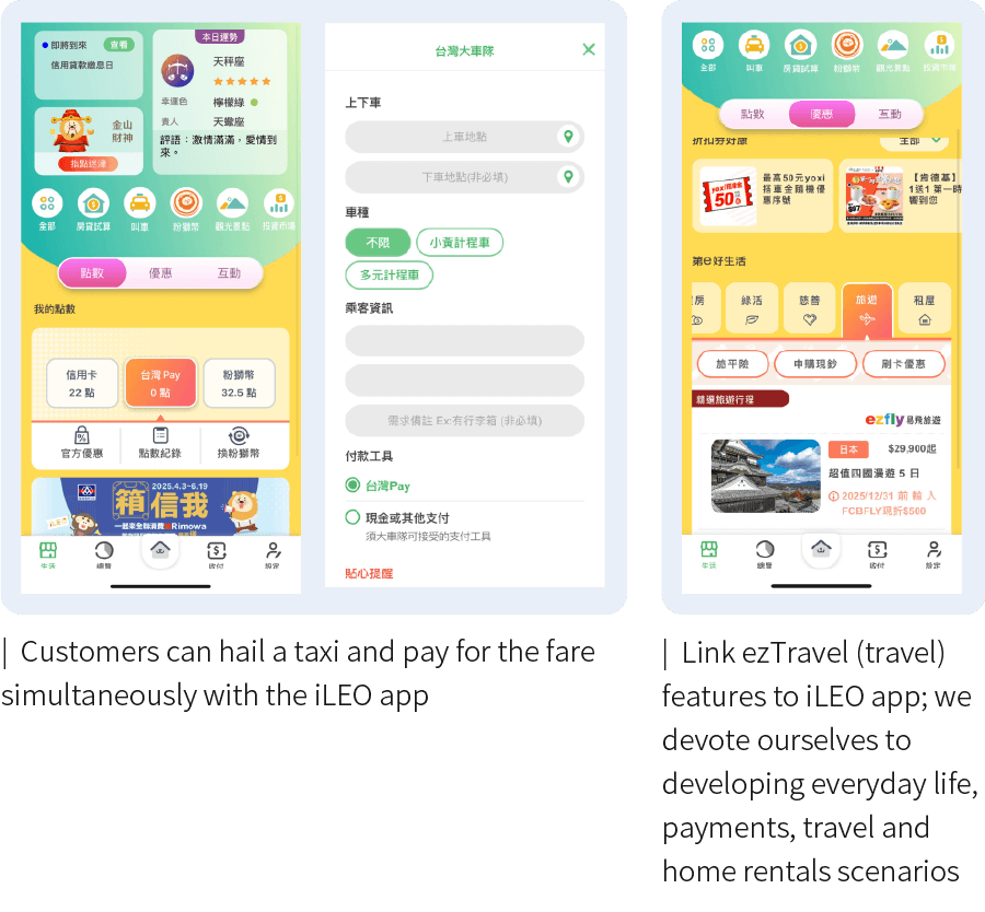Development of the Bank as a Platform (BaaP) model has gradually matured. For example, we have rolled out the dedicated one-stop shopping "First Good Life" zone on the iLEO app, covering four scenarios including travel, home rentals, green consumption and charity. Since going online in November 2023, the service had accumulated more than 200,000 visits as of the end of 2024. Moreover, we have also partnered with the 55688 Group's Taiwan Taxi, the largest taxi fleet operator in Taiwan. Through cross-industry alliance and API integration, customers can hail a taxi and pay for the fare simultaneously with the iLEO app, as part of our efforts to provide a convenient, friendly and safe service platform.