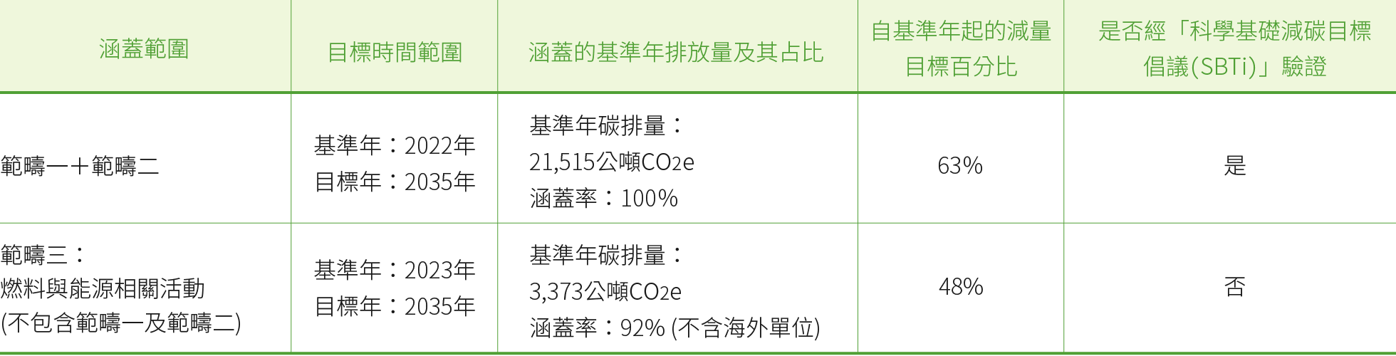 全集團減碳目標之訂定與SBTi規範全球升溫不超過1.5C的路徑保持一致,即2025年範疇一、二碳排量較基準年(2022年)減少14.54%,即減少3,128.21公噸CO2e。