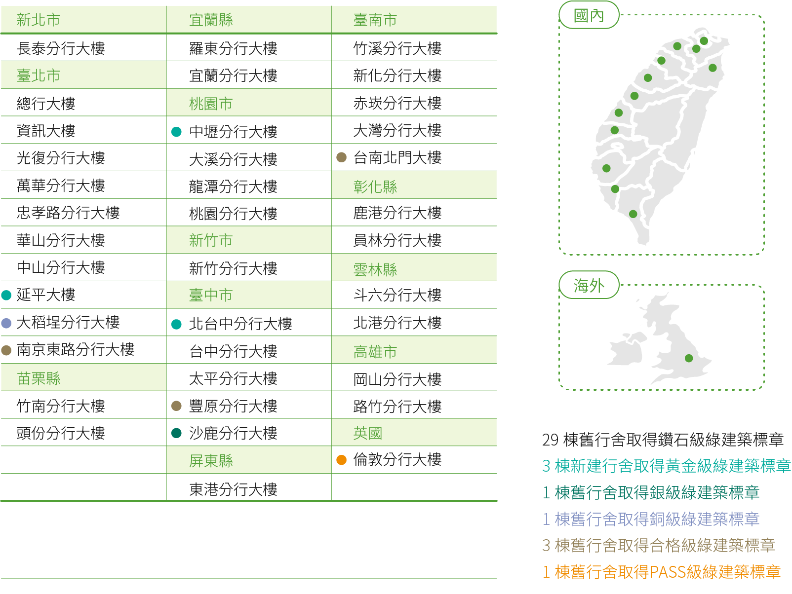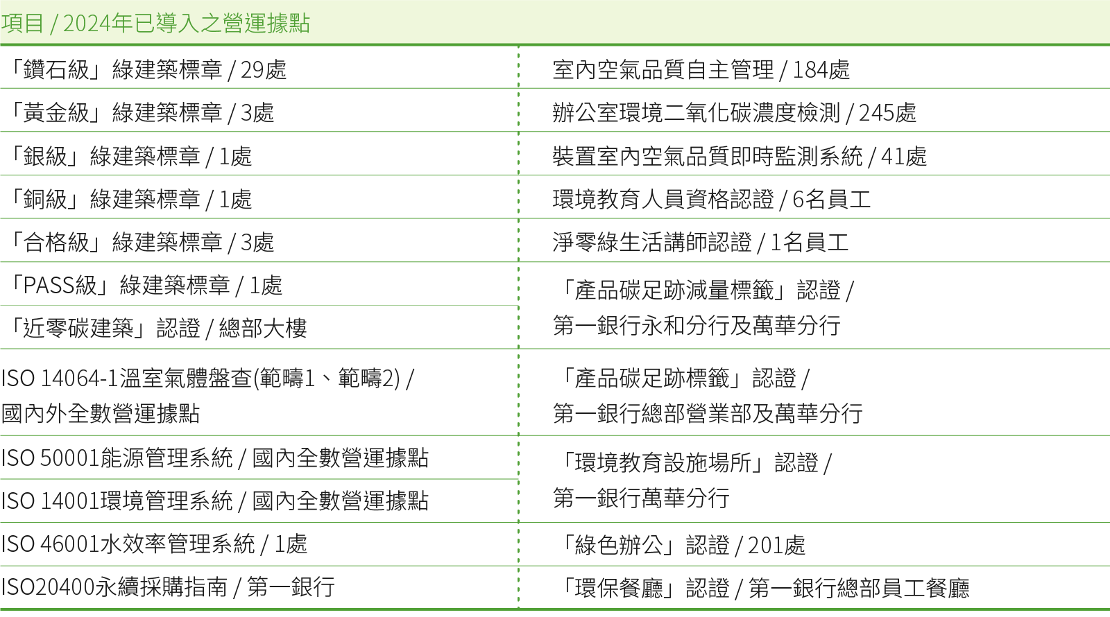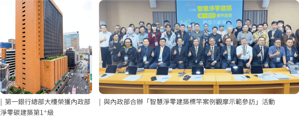 第一金控為落實環境永續行動,從2010年組成「綠建築標章取得計畫」團隊,陸續改造自有行舍為綠建築,截至2024年底已取得38處,包括改造35處舊行舍得內政部綠建築標章(含29處鑽石級、1處黃金級、1處銀級、1處銅級及3處合格級),以及2處新建大樓取得黃金級綠建築標章,海外首處則係2021年倫敦分行大樓取得英國建築研究機構(BRE)PASS級綠建築標章,預計2030年將累積50處據點取得綠建築標章,此外,總部大樓經內政部評定為既有建築能效標示第1+級(近零碳建築),2024年更與內政部合作辦理「智慧淨零建築標竿案例觀摩示範參訪」活動,出席者包含內政部建築研究所及台灣智慧淨零建築產業聯盟成員,共47人參與,本集團分享節能減碳經驗,樹立國內金融業綠建築的典範。
