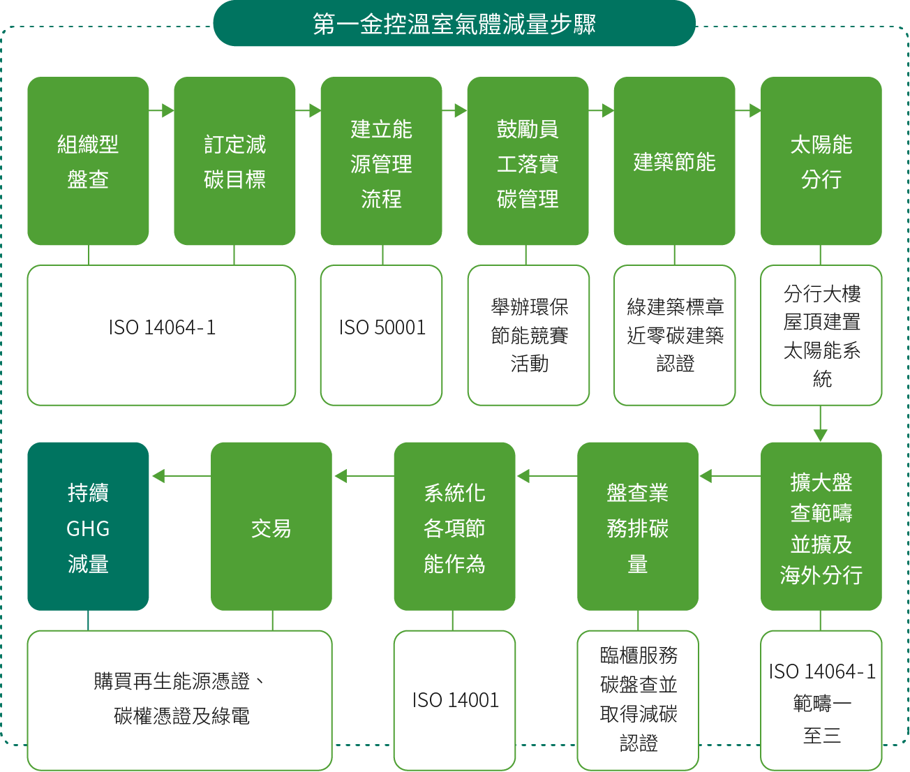 除逐年改造自有行舍取得綠建築標章外,自2017年起將國內外全數營運據點納入「ISO 14064-1 溫室氣體盤查」之範疇並取得驗證,全盤掌握集團各營運據點碳排放情形,並自2020年起連續5年辦理國內營業單位碳管理及節電競賽,致力達成溫室氣體減量之目標。