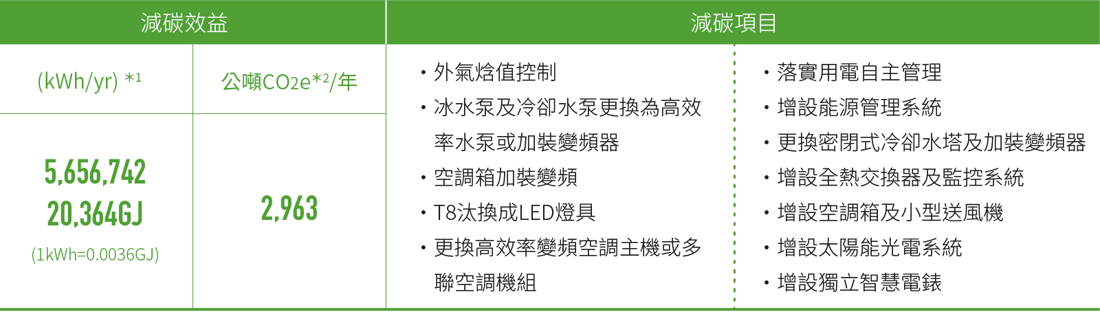 *1:主要以改善空調及照明設備之前後效能差異及預估其使用時間來估算減碳效益。