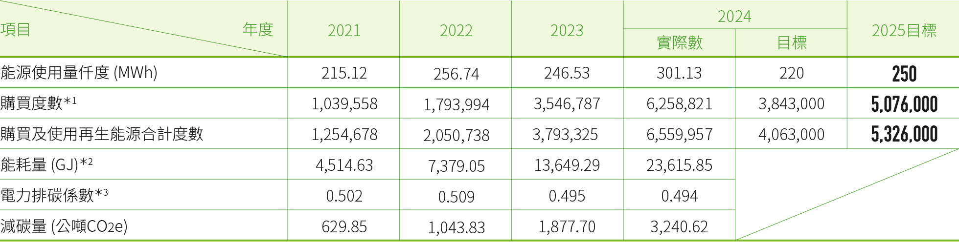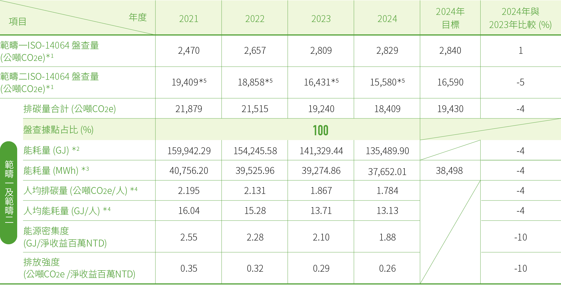 *2:能耗量(GJ)主要係根據自行設立之電表統計用電度數,係數之轉換2021~2024年則係依據2020年能源統計手冊-能源產品單位熱值表之參數。