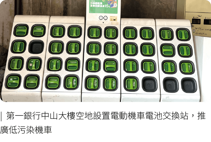 第一金控為降低公務運輸造成之碳排放量,將綠色運輸導入內部執行,鼓勵員工使用大眾交通工具通勤,更設有公用悠遊卡制度,提供同仁外出洽公落實搭乘大眾運輸;而公務車系統則逐步於汰換時優先評估更換為電動車輛、油電混合車輛或能源轉換效率較高之車輛,至2024年底公務車計有196輛為油電車款,占全部公務車比例達45%,2024年更與Uber簽訂企業減碳方案,優先選擇搭乘減碳車輛,降低公務車用油碳排放量,且於中壢分行及延平大樓設置電動汽車充電站,提供員工及往來客戶使用。亦陸續將已屆報廢年限之傳統燃油機車汰換為電動機車,至2024年底完成更換121輛電動機車,每年減碳量約為45公噸CO2e*,並於中山、大稻埕、北投、新興、草屯分行、延吉宿舍及資訊大樓共7處空地設置電動機車電池交換站,推廣低污染、省能源、智慧化的機車。此外,我們於全臺營運據點密集區域及偏遠地區設置15處員工宿舍,減少員工上下班交通往返產生之排碳量。