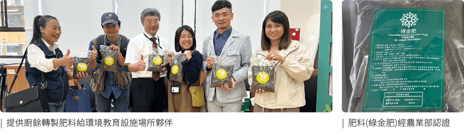 為響應循環經濟,2023年起將廚餘轉化作為堆肥,透過分類、收集與資源化,使用碎形加速發酵的技術將環保餐廳之廚餘製成肥料,迄今已收集6公噸廚餘,產出有機栽培介質約2公噸,獲農業部核發「綠金肥」肥料登記證。「綠金肥」已應用於第一銀行綠色金融教育館、第一財經辦公大樓及長安大樓綠屋頂,提供植物所需養分,促進資源循環再利用。