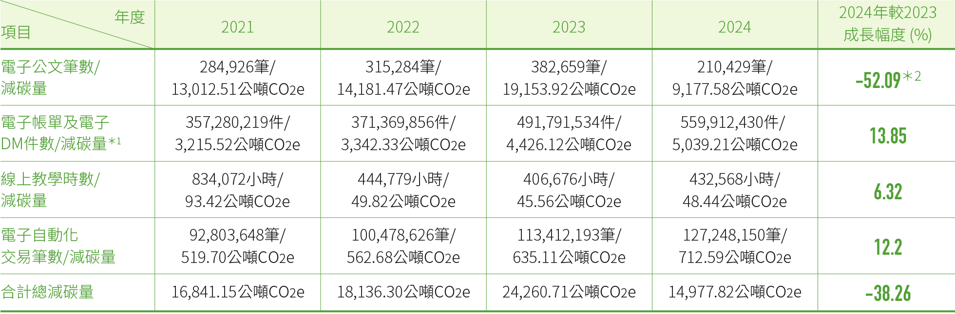 *1:電子帳單及電子DM減碳量係依據環境部網站(臺灣產品碳足跡資訊網),一張B4紙排碳量為0.009公斤CO2e計算;電子自動化交易減碳量則係根據一張A4紙排碳量為0.0056公斤CO2e計算。