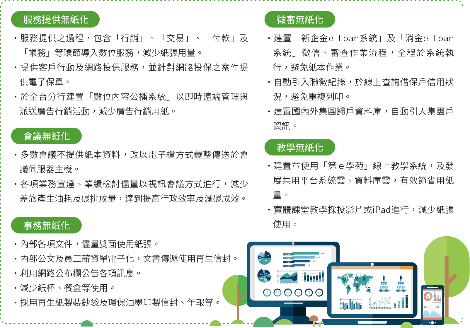 第一金控提升資訊設備效能並汰換老舊伺服器,實施教學無紙化、會議無紙化、服務提供無紙化及事務無紙化。徵授信作業流程全程於系統執行,自動引進聯徵資料、國內外集團戶歸戶作業;另於提供服務的過程,將包含行銷、交易、付款及帳務等環節導入數位化服務。2023年第一銀行更與友達旗下「創利空間」合作,於全台184家分行建置數位內容公播系統(WMS)。透過WMS中控管理系統,於可即時遠端管理分行顯示器與派送廣告行銷,提升更優質的數位服務體驗,逐步邁向行銷無紙化作業。