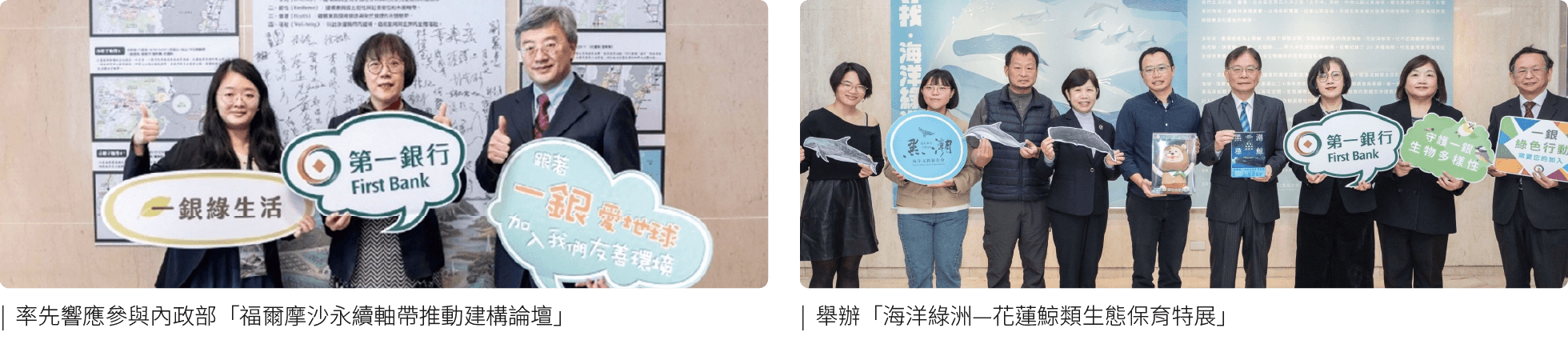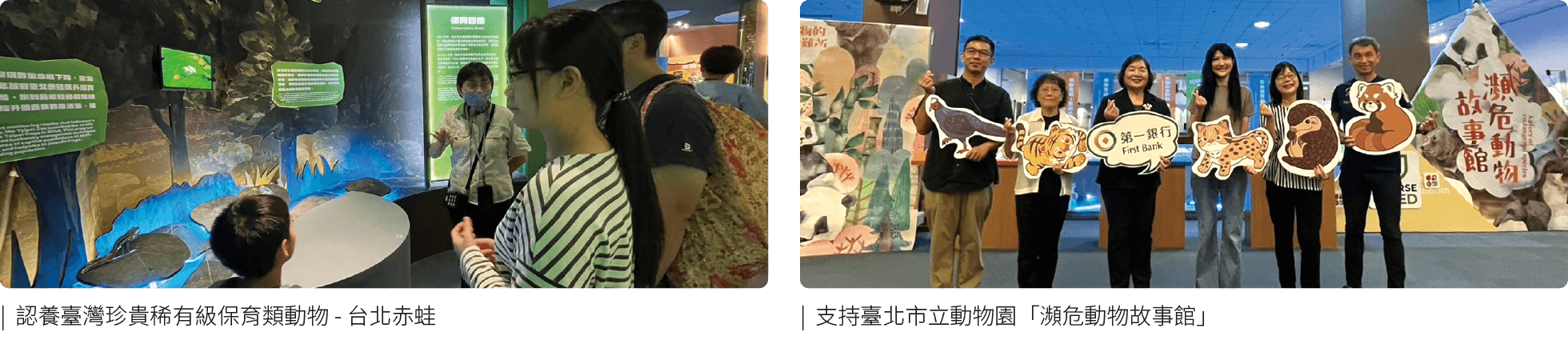 ・支持臺北市立動物園「瀕危動物故事館」,共同規劃展示及辦理活動,並認養臺灣珍貴稀有級保育類動物-「台北赤蛙」,以實際行動響應環境議題,且結合員工親子活動-「第一銀行家庭日-輕鬆FUN一下」,更合作錄製Podcast,讓大眾更了解保育瀕危動物的重要性。