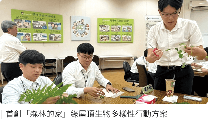 ・首創「森林的家」綠屋頂生物多樣性行動方案,與環境教育夥伴-芝山文化生態綠園共同推動,於本集團2處零碳綠屋頂(綠色金融教育館與第一財經辦公大樓)打造金融業首創的都市跳島示範場域,辦理永續金融綠行動夏令營2場次、新進MA增能訓練1場次,促進員工與社區民眾之參與,以廢棄樹枝、木材邊角料、網架等材料製作各種生物居所。