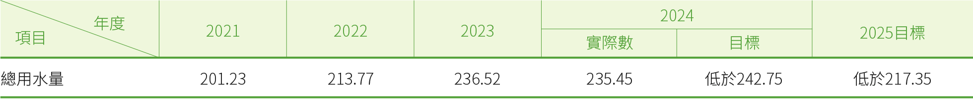 第一金控2012年落實雨水回收再利用之理念,於總部大樓地下室設置儲水量1.30百萬公升的雨水回收池,用於澆灌花圃及馬桶用水;除總部大樓外,更將經驗複製到分行大樓,2020年於延平大樓及中壢分行設置雨水回收池,萬華分行建置雨水回收系統,用於澆灌頂樓綠屋頂以充分利用水資源。2024年集團總用水量為235.45百萬公升,用水來源99.98%來自自來水,0.02%來自總部大樓地下溢流湧水及雨水,並詳實調查各營運據點之用水狀況。總用水量統計範圍除原本第一銀行國內全數營運據點及證券、投信、人壽、AMC之總公司外,2022年擴及證券、投信、人壽、AMC之國內分支機構。