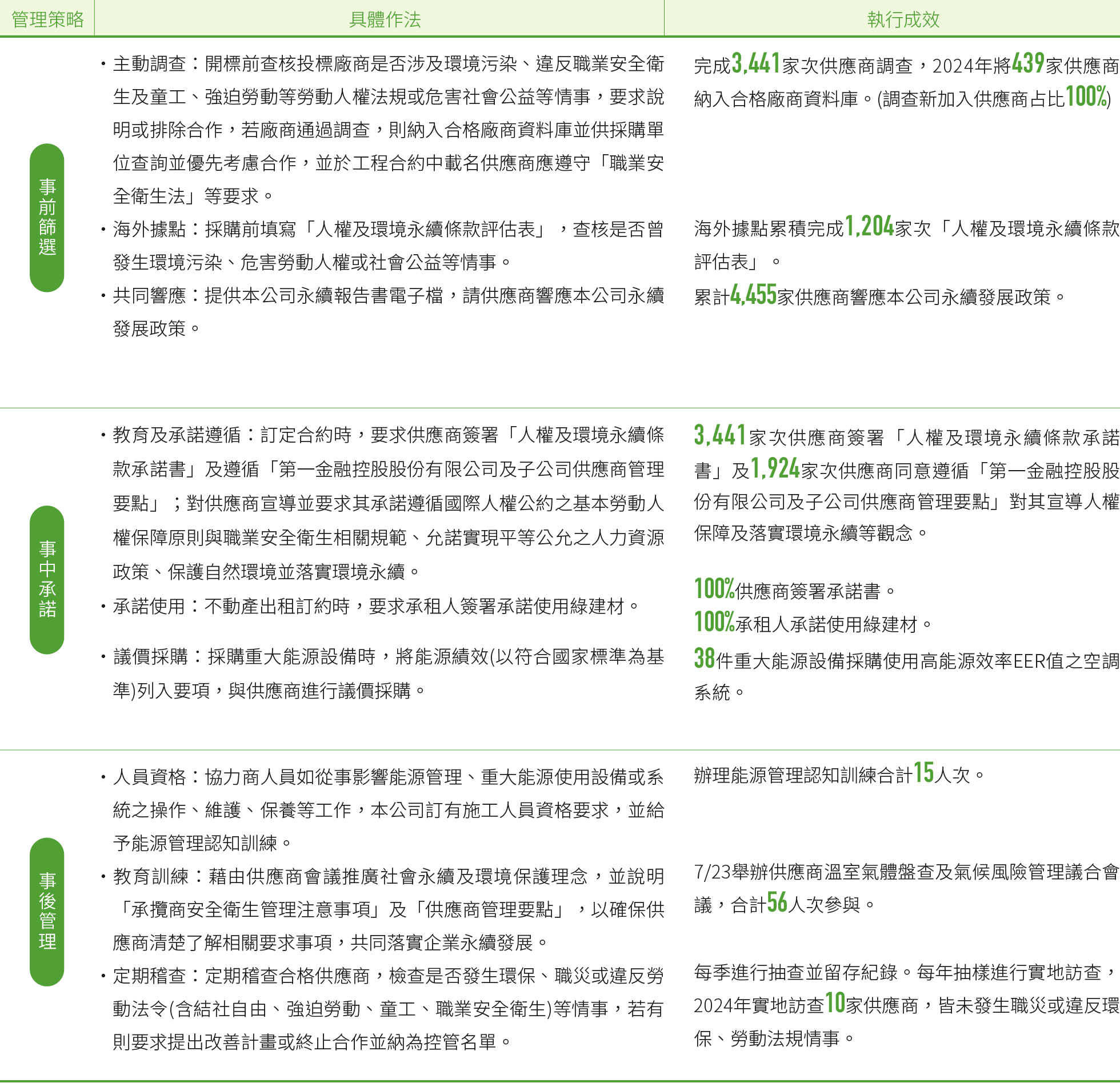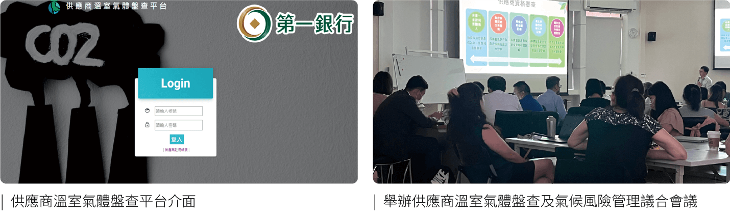 為實踐對環境負責任的營運模式,積極建立綠色供應鏈,第一金控自2022年起強化供應商ESG風險管理,加入ESG風險因子檢核項目,同時調查採購金額較大之供應商,於2024年7月舉辦供應商溫室氣體盤查及氣候風險管理議合會議,輔導供應商逐步完成碳盤查,並選定採購金額大於100萬元以上且近2年有往來合作之資訊設備與維護、印刷廣宣等廠商共120家於「供應商溫室氣體盤查平台」完成碳盤查資料填報,並據以評分,評分結果A、B級之廠商於2025年參與採購招標時可獲履約保證金折扣優惠,鼓勵供應商之低碳管理作為。