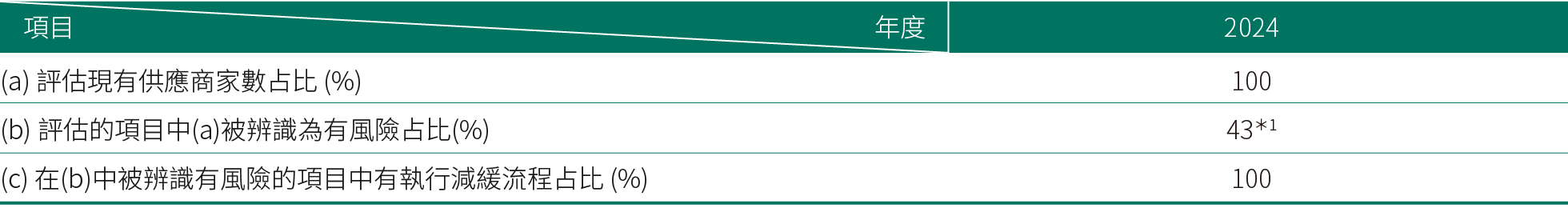 *2:本公司未曾有供應商於契約簽署前或合約期間內,因違反勞動法規受裁罰而未改善者,故無與供應商終止合約案例。