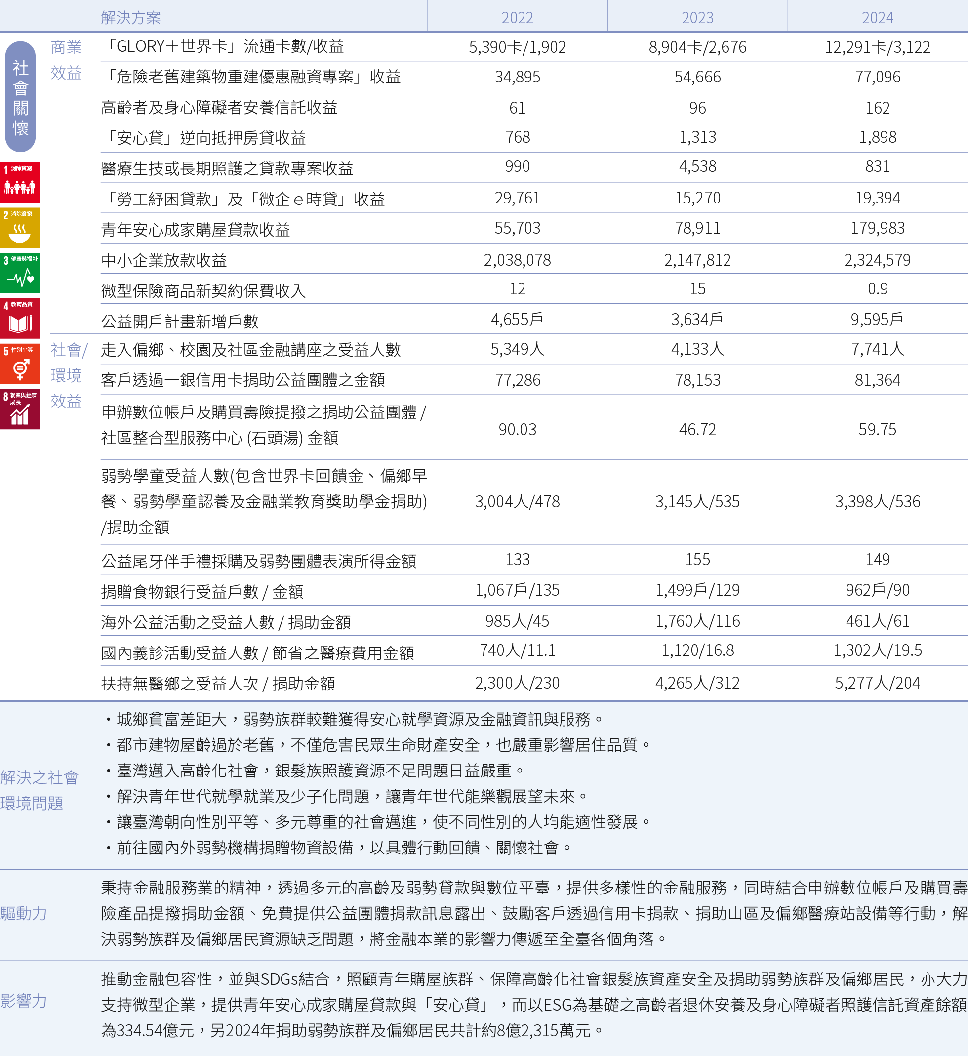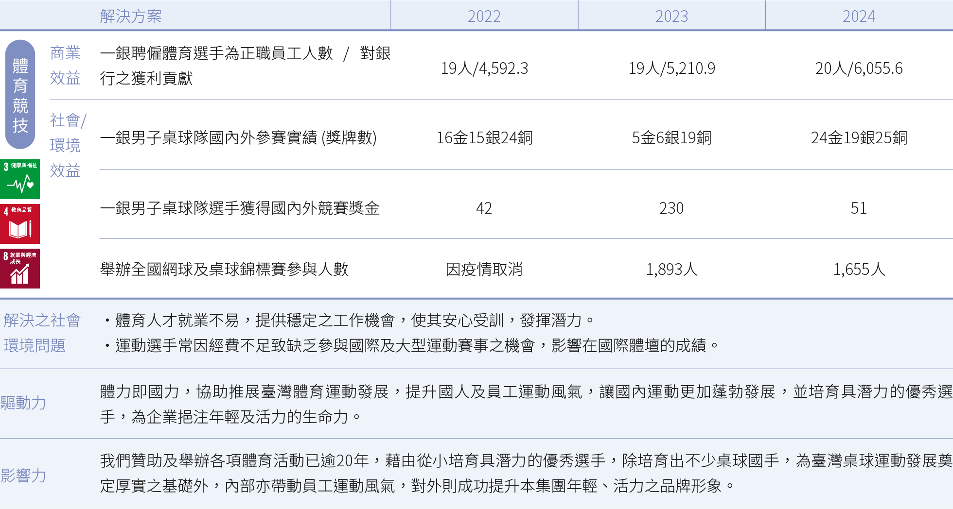 第一金控呼應聯合國永續發展目標(SDGs),積極運用核心職能協助解決社會及環境問題,2024年持續聚焦「綠色關懷」、「社會關懷」、「藝術文創」及「體育競技」四大公益策略,整合集團各子公司、第一銀行文教基金會及第一銀行志工服務隊資源,攜手客戶、供應商與非營利組織共同投入公益活動,除提升品牌形象及企業之社會價值,亦帶動整體營運成長。