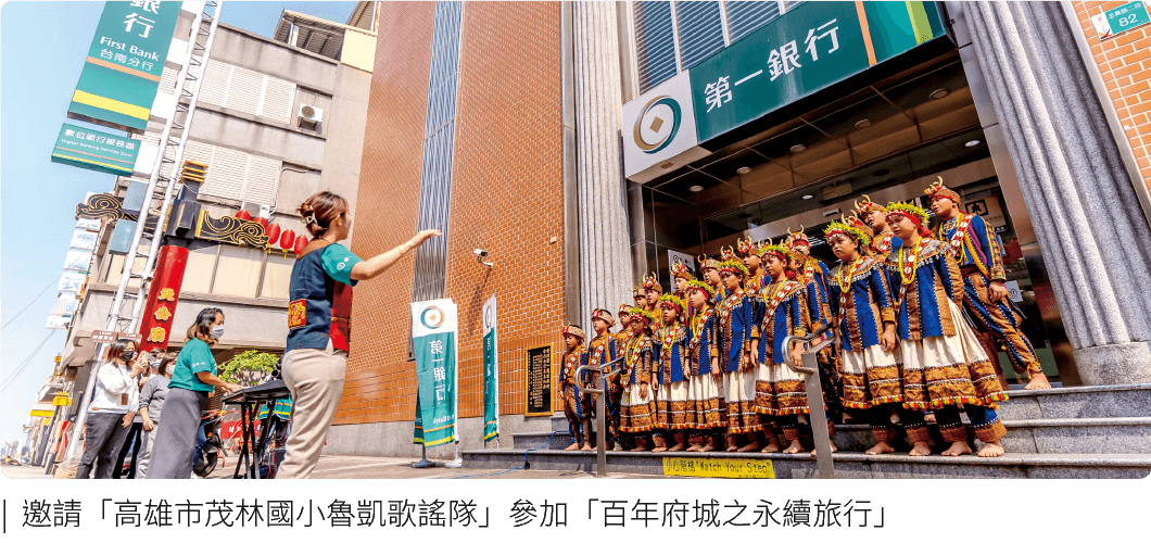 邀請「高雄市茂林國小魯凱歌謠隊」及「臺南市崇學國小棒球隊」參加「百年府城之永續旅行」文史導覽,並由「高雄市茂林國小魯凱歌謠隊」進行奇美博物館及台南分行快閃,以實際行動守護府城在地文化,支持地方創生發展。