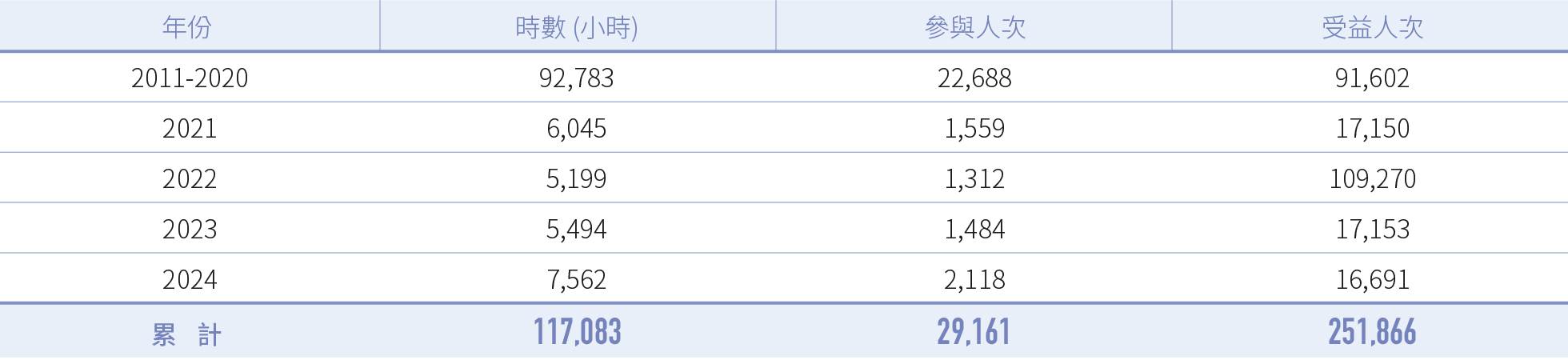 第一金控自2011年起成立志工服務隊,包括推廣環境永續的「綠色志工」及關懷弱勢的「愛心志工」。2024年共辦理173場公益活動,其中愛心志工活動57場、綠色志工活動46場及走入校園與社區金融知識宣導活動70場,自2011至2024年止,集團志工參與活動已達29,161人次,並有251,866人次受益,服務總時數高達117,083小時。為了解參加人員對志工活動之滿意度,2024年發放8,090份調查問卷,問卷回收率98.71%,其中89.44%對活動舉辦內容表示滿意。