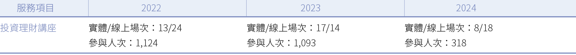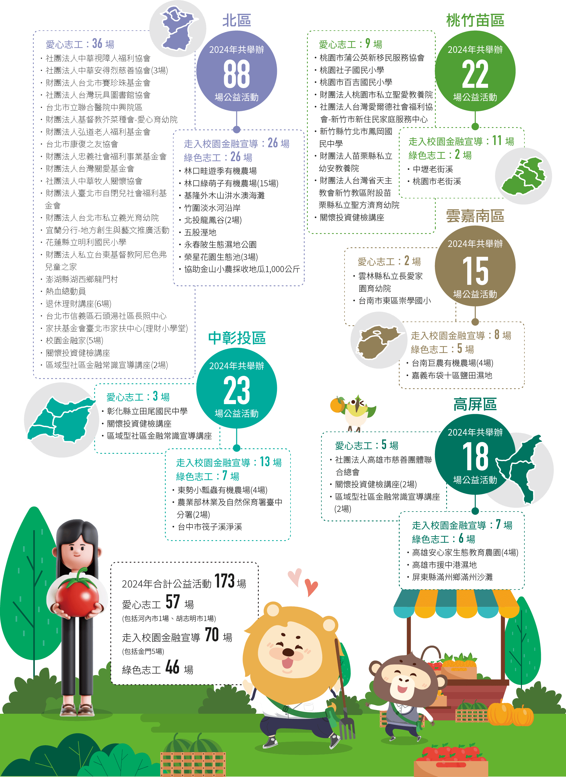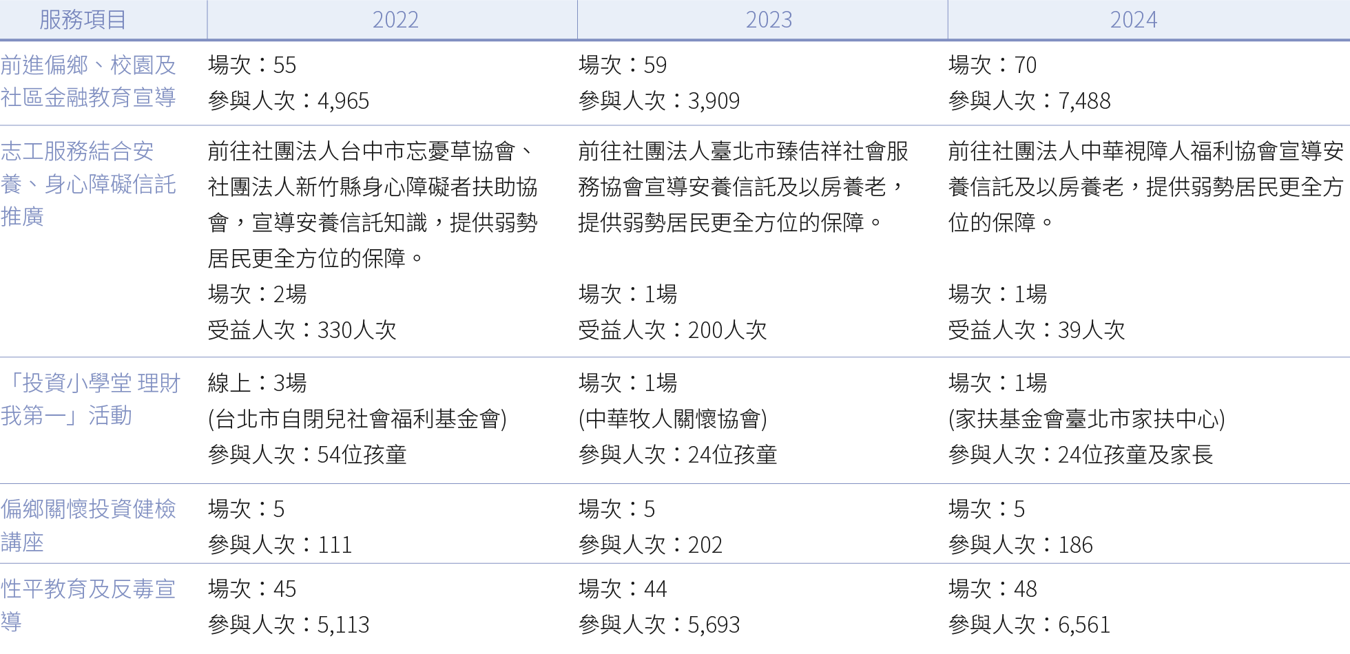 ・舉辦57場愛心志工活動及70場金融教育宣導,陪伴獨居老人、弱勢族群。